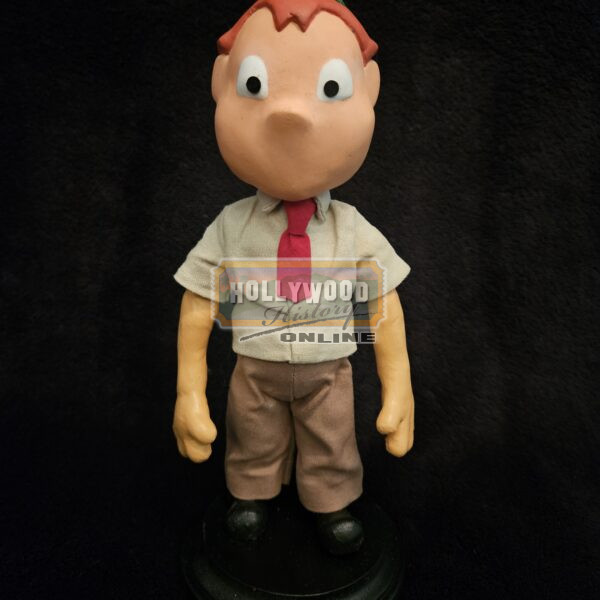 From the Adult Swim stop motion series Moral Orel, this is a screen used Doughy Latchkey puppet. Orel’s best friend, he depends on Orel and God for guidance. While he often gets scared during his misadventures with Orel and tries to talk his pal out of seeing his plans to the end, Doughy is always willing to help. This amount of trust in Orel’s judgement, while sweet, often ends in disaster. Comes with the base seen in the pictures and approx. 10″ in height.