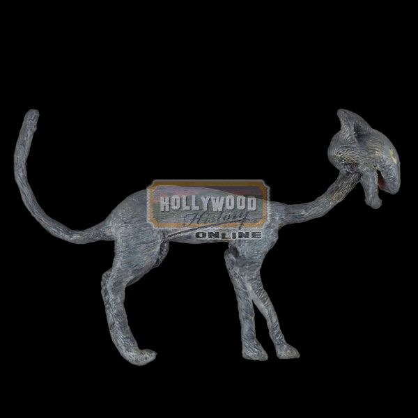 Sally’s (Catherine O’Hara) stop-motion cat puppet from Henry Selick’s classic, The Nightmare Before Christmas. A stray cat roamed the streets of Halloween Town during the opening sequence. Later during the “Sally’s Song” sequence, the cat approached Sally and listened to her lament over her dear friend Jack Skellington. Created for stop-motion animation, this jointed cat puppet consists of a resin body and head with jointed foam and metal armatures on the neck, limbs, and tail. Following production, the puppet underwent extensive sympathetic restoration by Tom Spina Designs to rebuild damaged foam latex on its legs, tail, and neck, as well as patching cracked areas of the face and body. Additional repainting was later undertaken to the cat’s pupils. The puppet exhibits chipped paint and foam material at the neck.