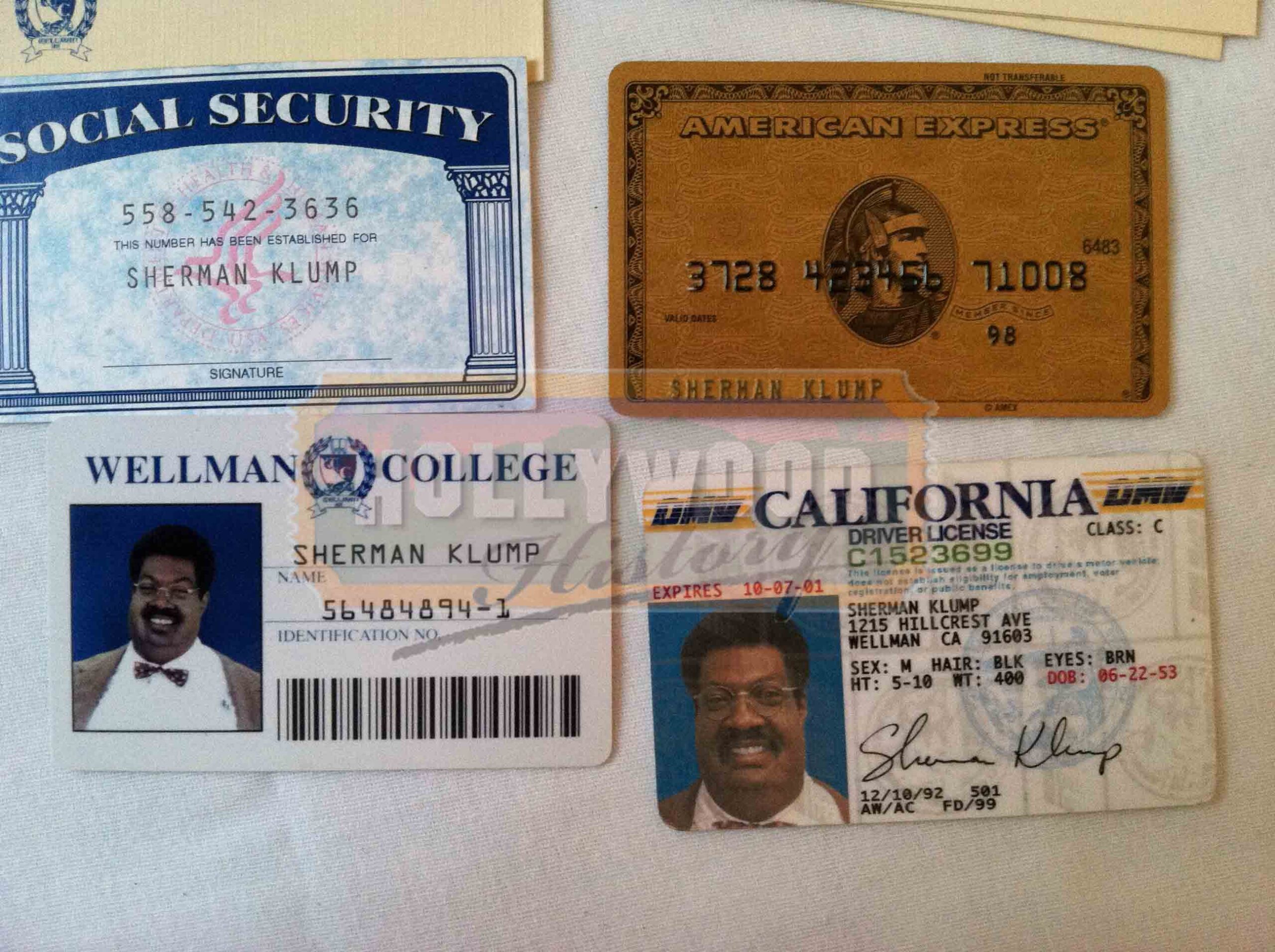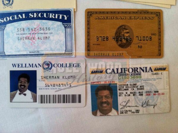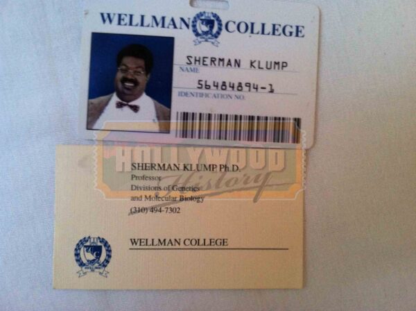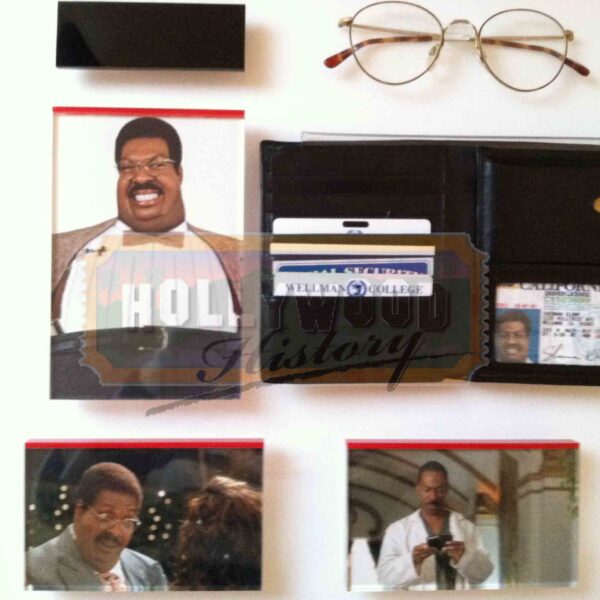 These glasses and wallet were used on screen by Eddie Murphy as “Sherman Klump” and “Buddy Love”. The glasses can be seen throughout the film. They are tortoise shell Flexon frames made by Marchon with non-prescription lenses. The wallet can be seen toward the end of the film after there is an accident in the lab and Buddy Love returns as his own person, not just Sherman’s alter ego. The wallet is a black leather wallet made by Rolfs. Inside is a California Driver License, 2 Wellman College identification cards, an American Express credit card, a Social Security card and a stack of Wellman College business cards all custom made with the name of Sherman Klump. Have other displaying needs? Please see our Custom Display Options, View our Gallery, or Contact Us for more information about Custom Displaying .