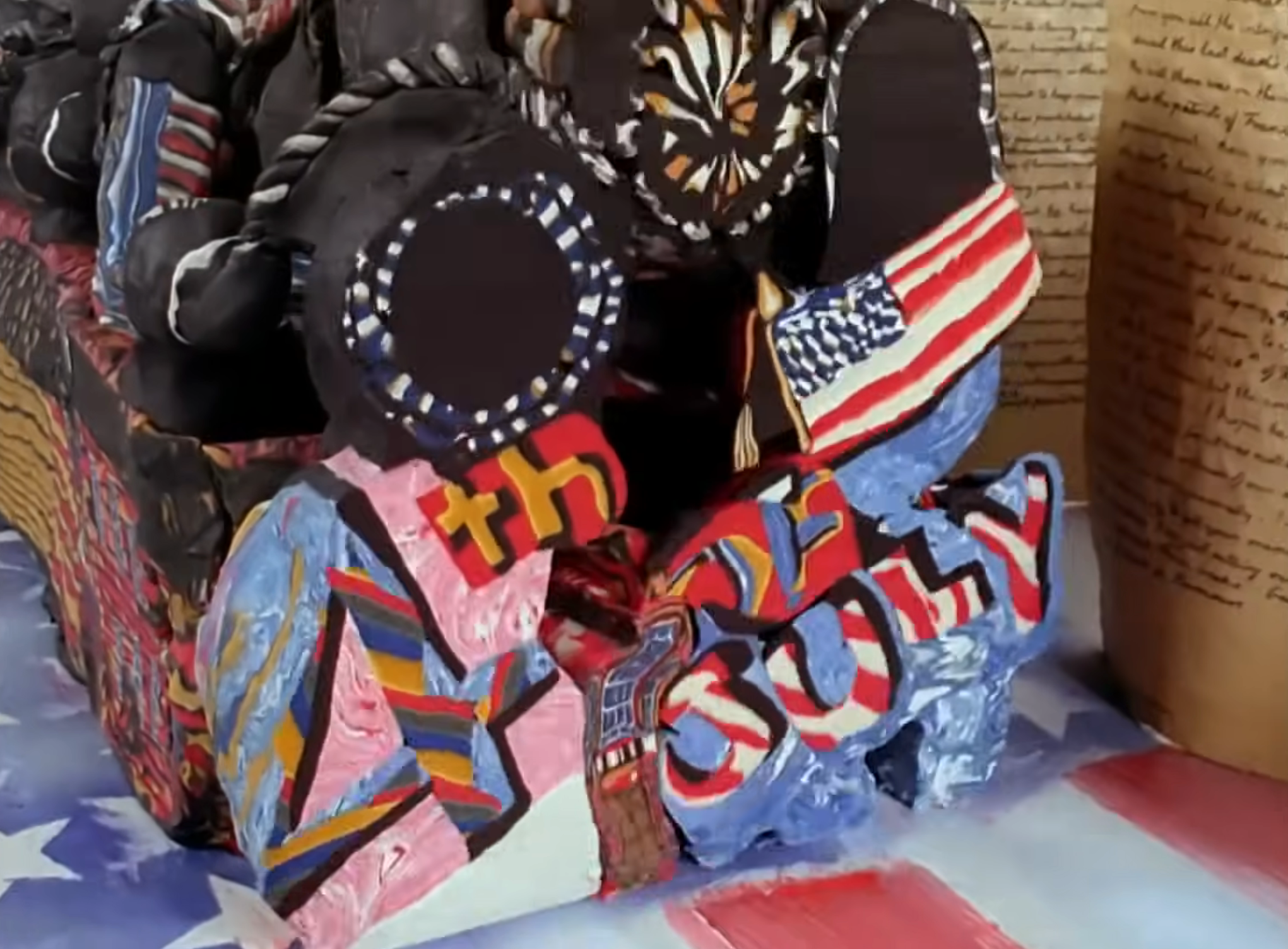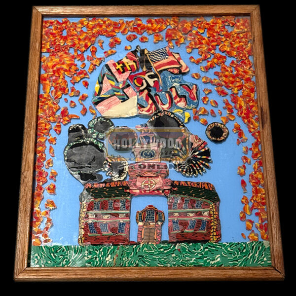 These are framed clay Strata-cut slices used during the animated 4th of July segment on Pee-wee’s Playhouse titled “School”. Strata-cut slices have been mounted inside a frame to protect the clay pieces along with the back of the display being signed by creator/animator: David Daniels.