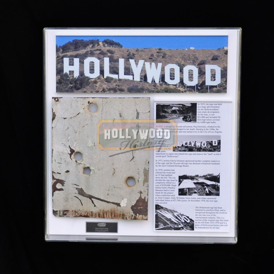 Of all the screen used movie props that exist, the historic Hollywood sign in the hills has been in more movies that any other. It is shown on the front cover of many DVDs, shown in the background in many movie scenes, and even a key prop in others. Hank Berger purchased the original Hollywood sign directly from the Hollywood Chamber of Commerce after its demolition in 1978, and it has remained in storage for over 25 years. Producer Dan Bliss acquired the Hollywood sign from Berger and owns the remaining pieces today. In November 2004, the Hollywood History Museum purchased a large unaltered section of the letter H from Mr. Bliss for $11,766.00. This section is now part of the museum’s permanent collection located at the intersection of Hollywood Boulevard and Highland Avenue in Hollywood. At that same time, four other large unaltered pieces were sold at auction to private individuals. This piece was cut from a larger piece and shows surface rust, literally layers of paint, and imperfect holes punched into it that prevented the sign from being blown over by wind.