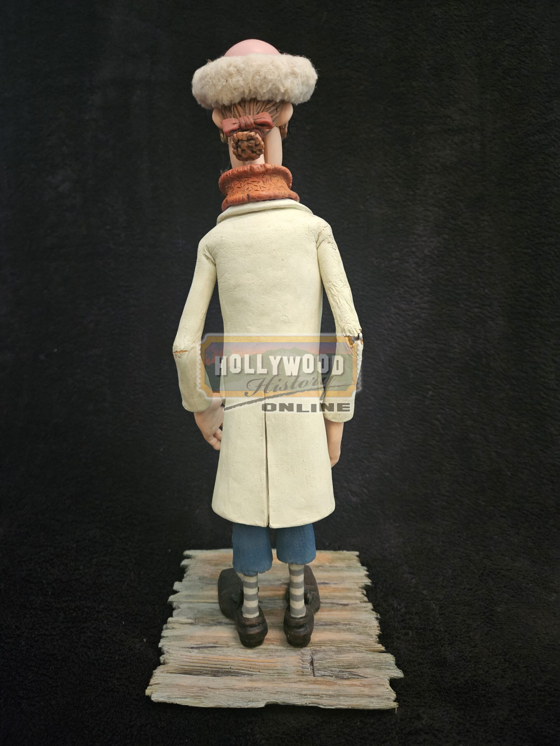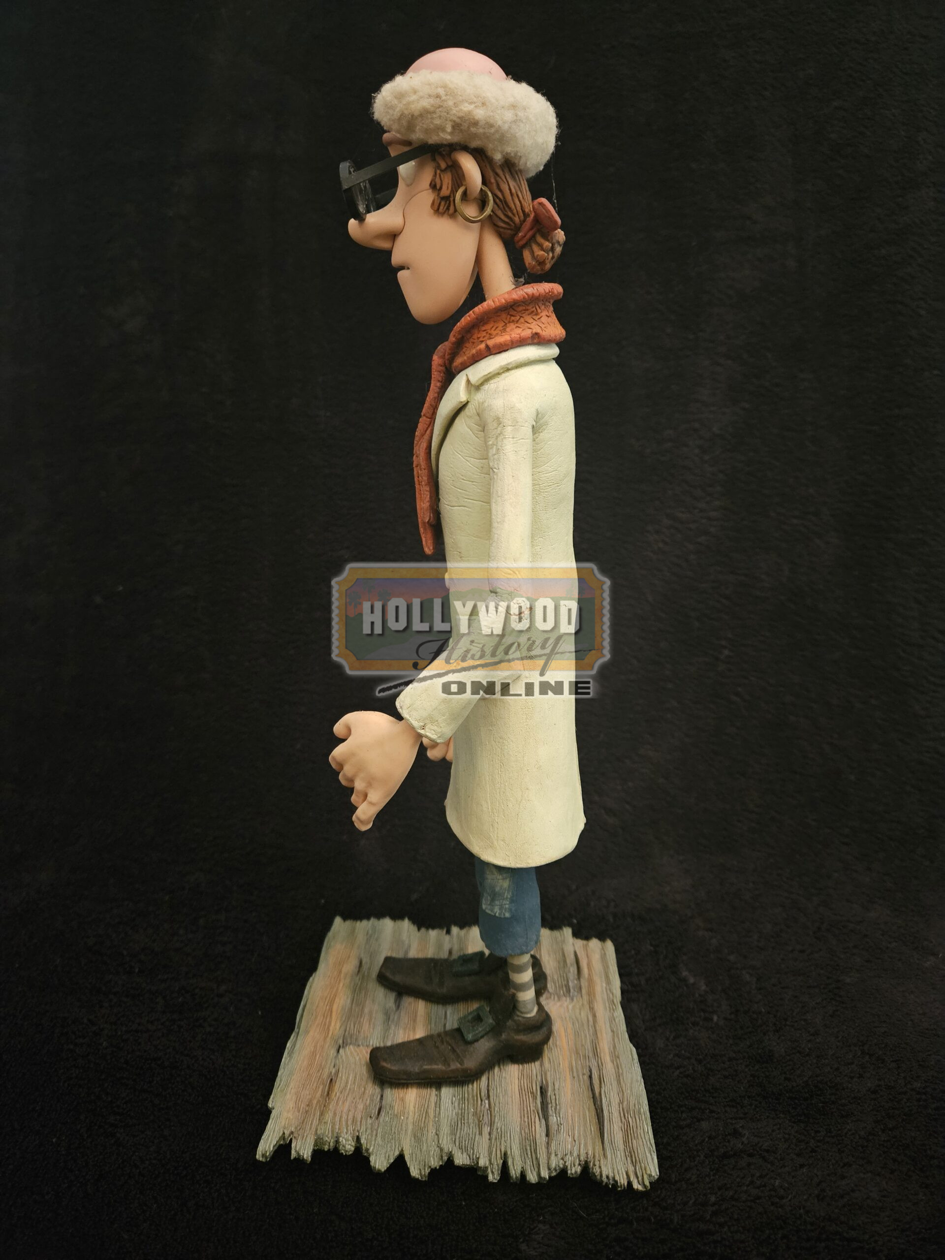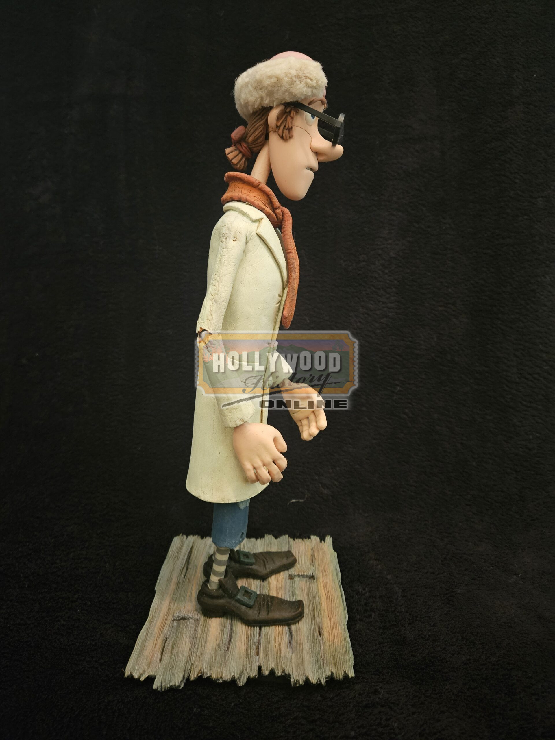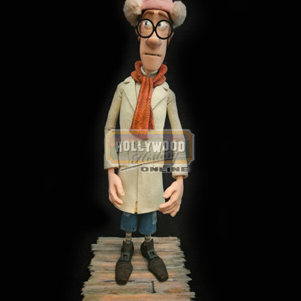 An original screen used stop motion puppet featured in the 2012 Aardman stop motion film, The Pirates! Band of Misfits (Known in the UK as: The Pirates! In an Adventure with Scientists!) This puppet, known as The Pirate with a Scarf or Number Two, is in his Scientist disguise. Voiced by Martin Freeman, this puppet can easily be seen throughout the Scientist of the Year competition. The outfit has been created from foam latex and his skin is silicon with a small amount of plasticine around his eyes and eyebrows, so to allow the puppeteers to change his expression as needed. He is entirely posable via the intricate internal steel armature, and also features an interchangeable mouth attached to the face with a small magnet. He is in excellent condition considering the usage during animating and measures approx. 12.5″ tall x 4″ at the widest point.