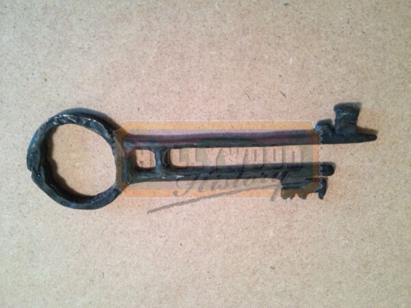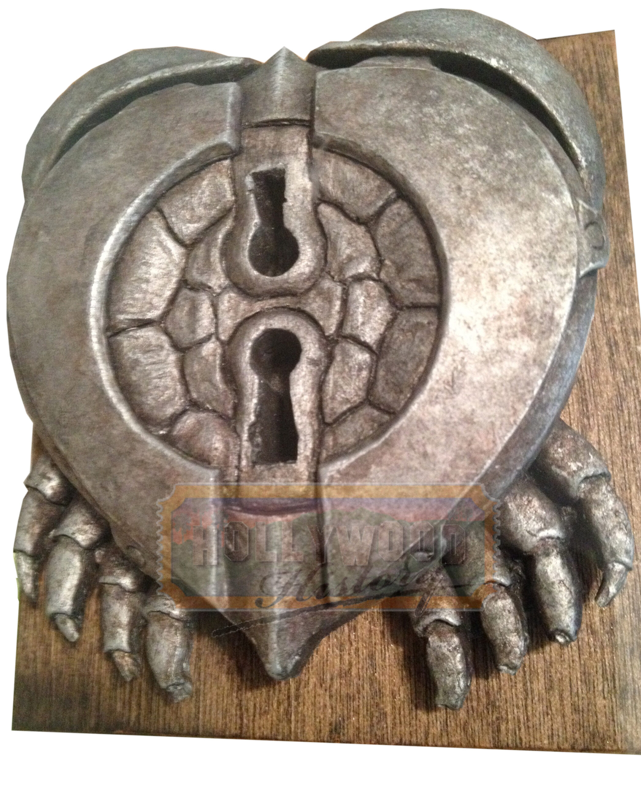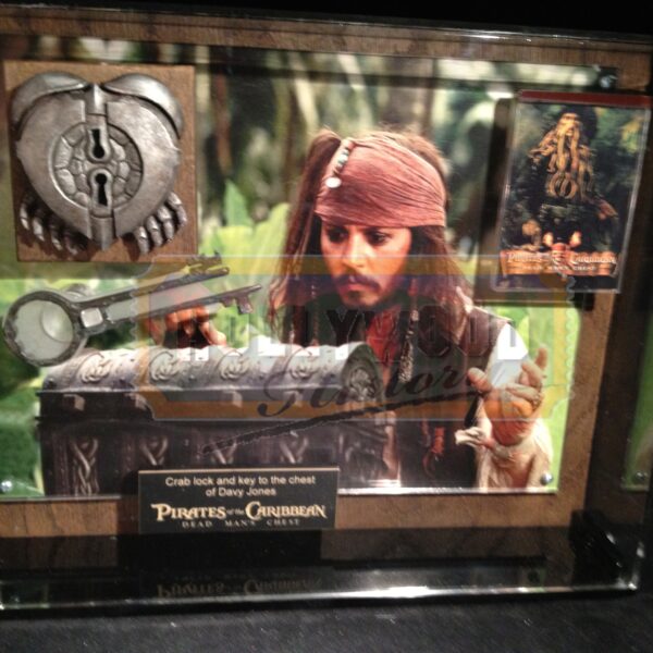 In this blockbuster sequel inspired by the Disney theme park attraction, director Gore Verbinski helms the continuing high-seas adventures of happy-go-lucky troublemaker Capt. Jack Sparrow (Johnny Depp), young Will Turner (Orlando Bloom) and headstrong beauty Elizabeth Swann (Keira Knightley). As Sparrow works his way out of a blood debt with the ghostly Davey Jones (Bill Nighy), he also attempts to avoid eternal damnation. This is Davy Jones’ crab lock and hero key used to open the dead man’s chest. The hero key was foundry made for whenever a hero version of the prop was required. This particular key was also employed as the master key for all the rubber stunt keys produced for the film. The exact amount of metal keys produced is unknown but it is assumed that six to twelve exist, and this is one of those. This crab lock was used in the film and can be seen on the chest when Jack Sparrow inserts the key. This exact crab lock was not only employed on one of the screen used chests, but it also represents the master unit for all the crab locks visible on the promotional chest seen at the various venues during the release of the film. This lock was the most difficult to recreate due to it’s complex undercuts and intricate details. Therefore, this crab lock was pulled off an original screen used chest and molded to save time. Along with a Hollywood History COA,and a custom display case; paperwork from Cool f/x will also be included documenting the history of these to fantastic piece from the pirates films.