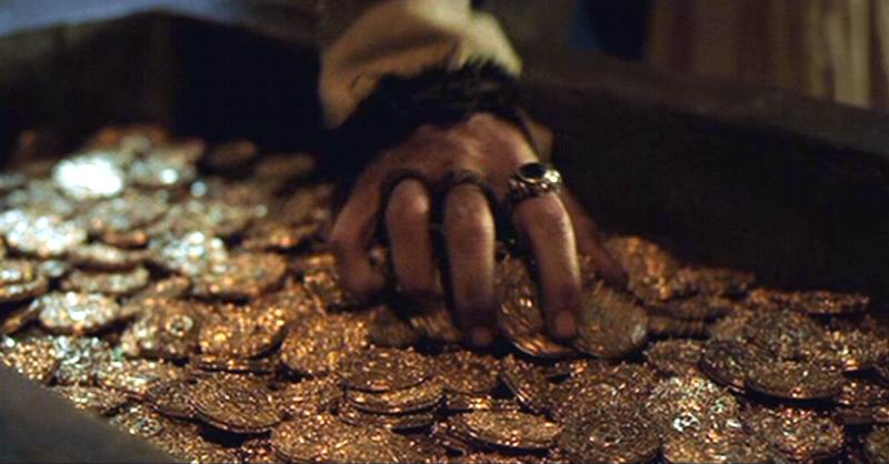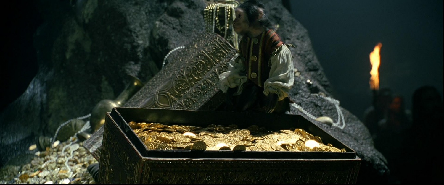 As the central prop in the film, this is an original -Cursed Aztec Gold Coin- from the hit movie Pirates of the Caribbean: The Curse of the Black Pearl. Starring Johnny Depp, Keira Knightley, and Orlando Bloom. This coin is double skull sided verses the hero version where one side features a skull-and-sun symbol and the reverse displays an Aztec glyph. This version was used in the chest scene where it was needed to show more coins with the skull and sun side facing up. The coin is made of a cast metal which has been plated in gold. It shows some minor wear but overall is in great condition. Dimensions: 1 1/2” x 1 1/2” x 1/4”