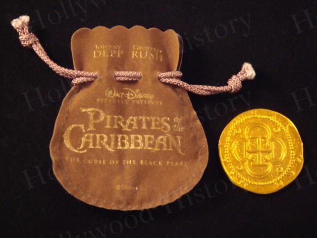 An original bronze pirate treasure coin used in The Pirates of the Caribbean. This type of coin can be seen towards the end of the film when Jack Sparrow finally finds the treasure. The coin is made of lightweight metal and painted bronze. Comes with a small pouch that has the movie title on one side and states authentic coin from the motion picture on the other.