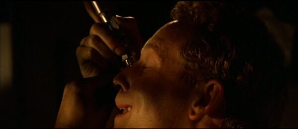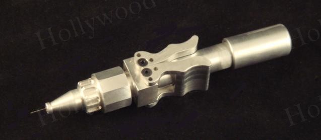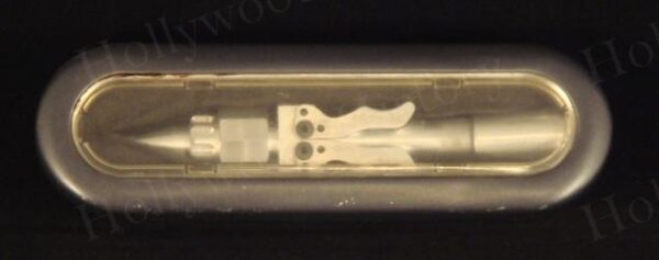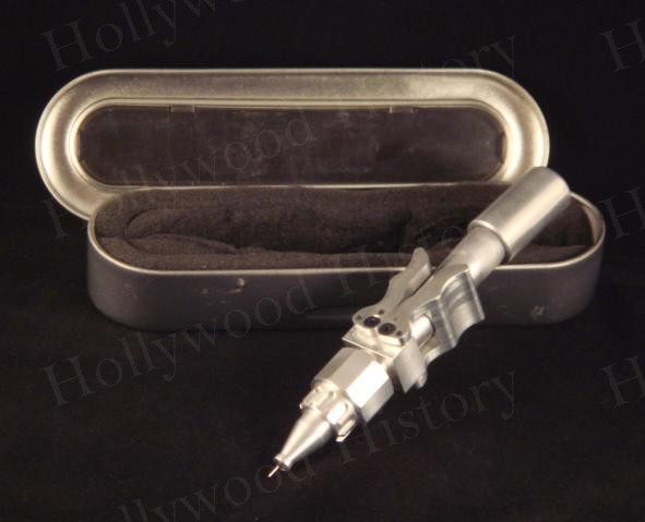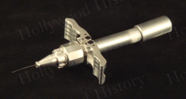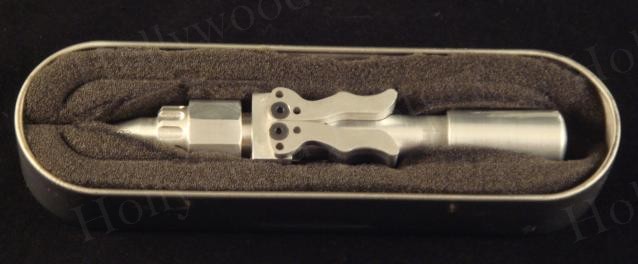 Set in the distant future, a spaceship carrying some 40 people, mostly ones wanting to settle on other planets from their own, hits a meteor shower and crash lands on a distant planet killing all but ten of them. The survivors, led by the second-in-command Carolyn Fry (‘Rahda Mitchell’ ), find themselves on a hot and arid landscape with constant sunlight from three orbiting suns. Fry not only must help the survivors find food and water, but contend with a deadly criminal, named Riddick (Vin Diesel), who was being transported to a prison cell on their destination. But every 22 years, the planet’s three suns go into a total eclipse for a month where darkness brings out the planet’s real inhabitants; large, reptilian, vampire-like creatures that come out and dominate the surface in total darkness, killing and eating all life. Fry and Johns then must cooperate with Riddick, who has surgically enhanced eyes to see in darkness, to lead them to safety and off the planet before they all become dinner for the creatures. This morphine injector was used by Johns played by Cole Hauser. Johns , besides being a bounty hunter is also a drug addict. Injector is made of machine metal and comes with a tin case. Injector measures approx 7.5″ in length