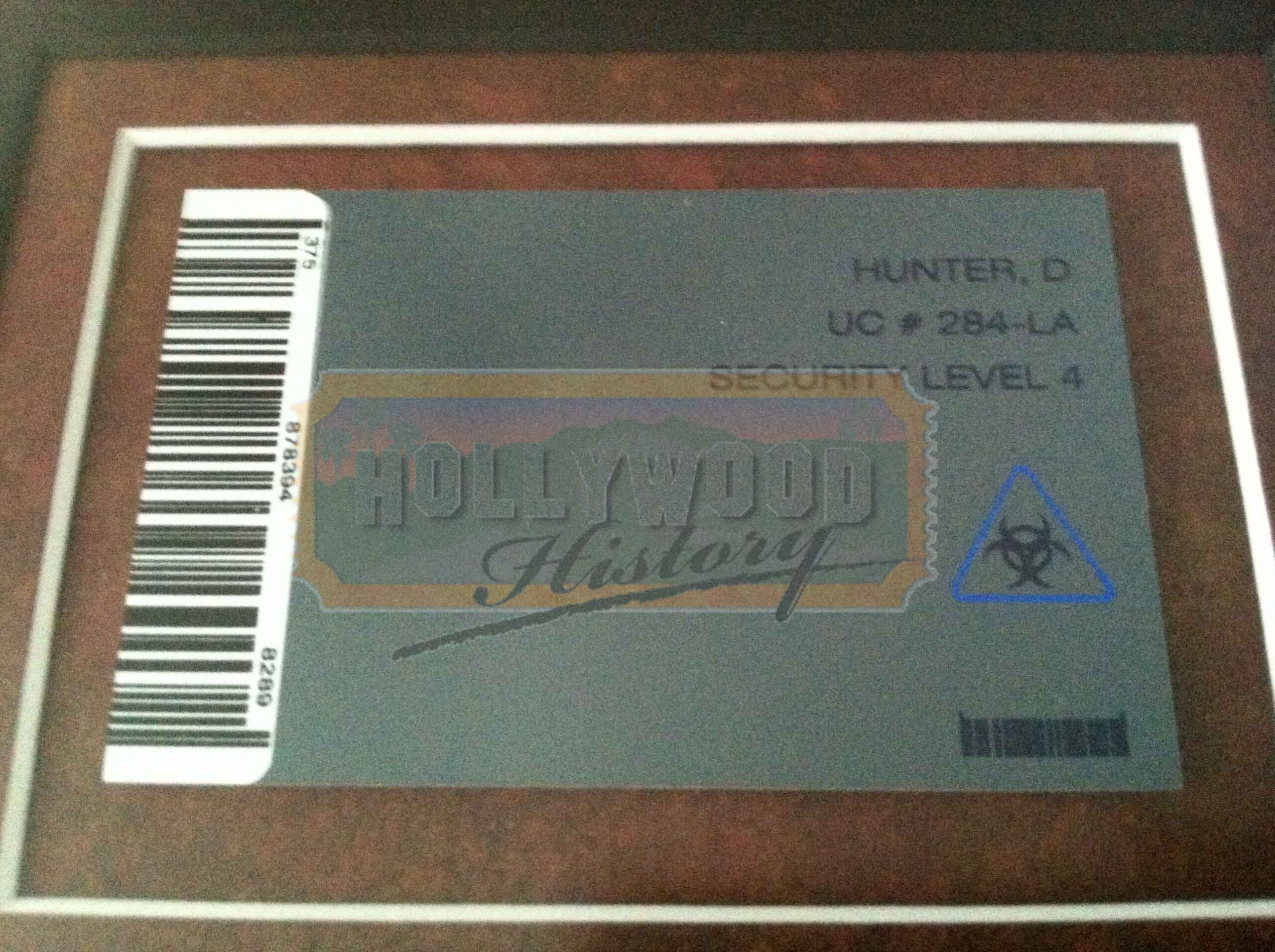 A special military unit fights a powerful, out-of-control supercomputer and hundreds of scientists who have mutated into flesh-eating creatures after a laboratory accident. In the film the production company used cast and crew members names as ID tag names for employees of the Umbrella Corporation. This ID is labeled D. Hunter UC# 284-LA Security Level 4. Danny Hunter was the Property Master for this film: Resident Evil. Have other displaying needs? Please see our Custom Display Options, View our Gallery, or Contact Us for more information about Custom Displaying .