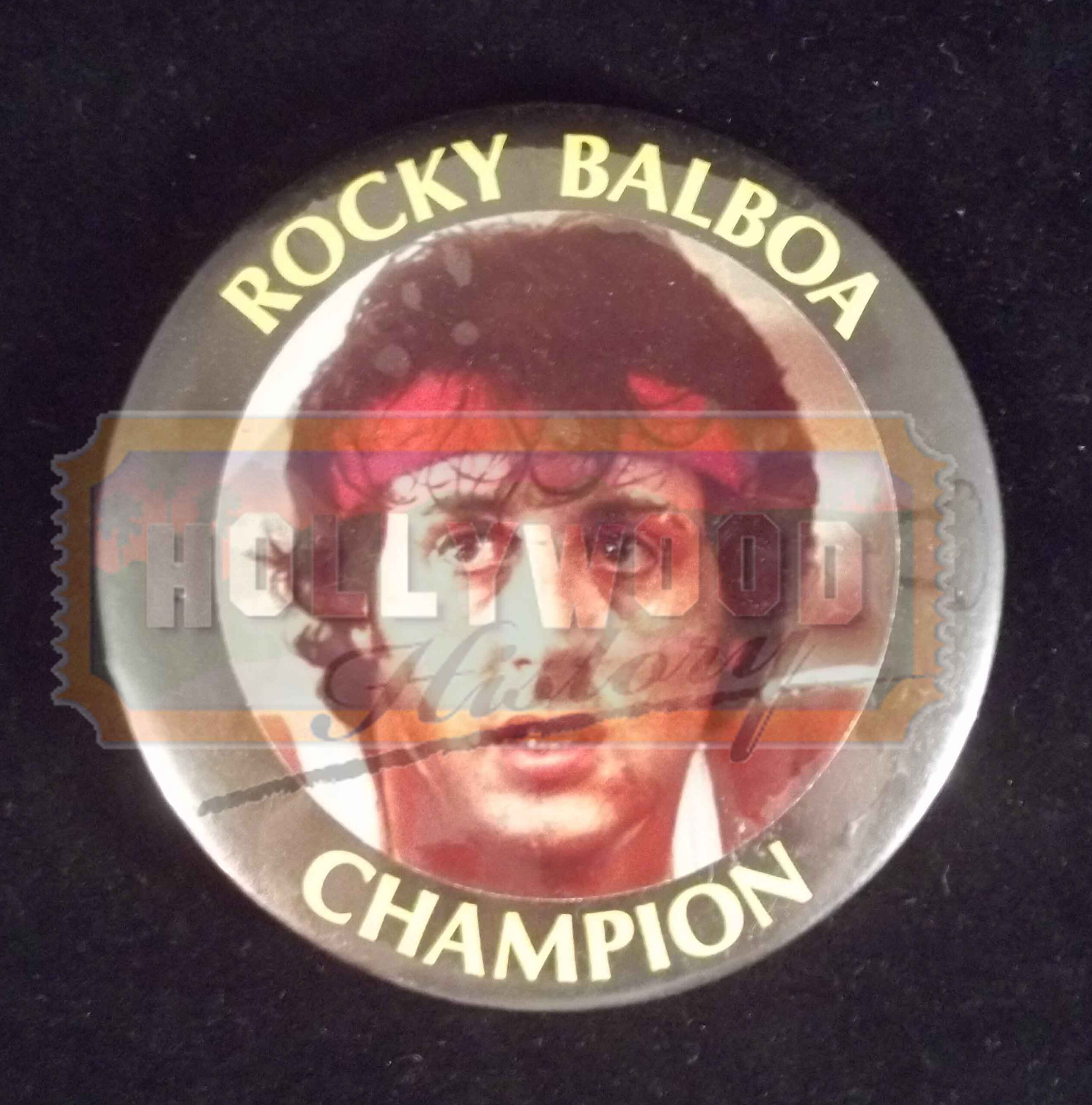 A Rocky Balboa Champion Pin from Sylvester Stallone”s 1982 sports drama, Rocky III. In the film, Rocky loses his heavyweight champion title to the unstoppable Clubber Lang (Mr. T). In order for Rocky to reclaim his victory, he must train harder than ever under his former rival, Apollo Creed (Carl Weathers). Pins of this style can be seen worn by Paulie (Burt Young) as he sells Rocky merchandise at a glamorized training session. Made from metal, this round pin features an image of Rocky Balboa from the second film, with “Rocky Balboa Champion” printed above and below the image. This button includes a locking pin on the back, allowing it to easily attach to clothing. Measuring approximately 4″ in diameter, this item features minor wear from production use and age.rnrnrnPlease see our Custom Display Options, View our Gallery, or Contact Us for more information about Custom Displaying this item.