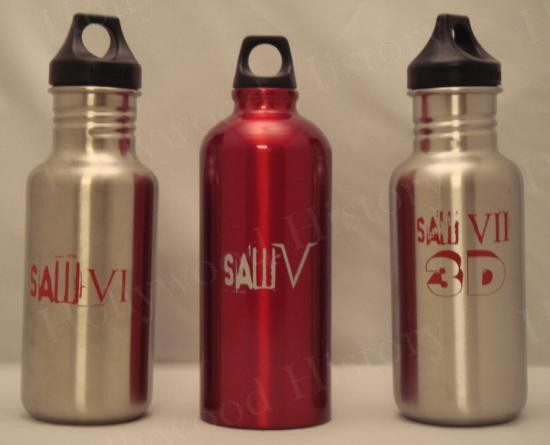 Set of 3 aluminum water bottles given to the crew on the set of the SAW films. The production decided to go green and did not want plastic water bottles on the set, so these were given to the crew to fill up with water. The bottles are from SAW V, VI and the yet to be released SAW VII in 3D. The bottles have not been used and measure 8″ tall.