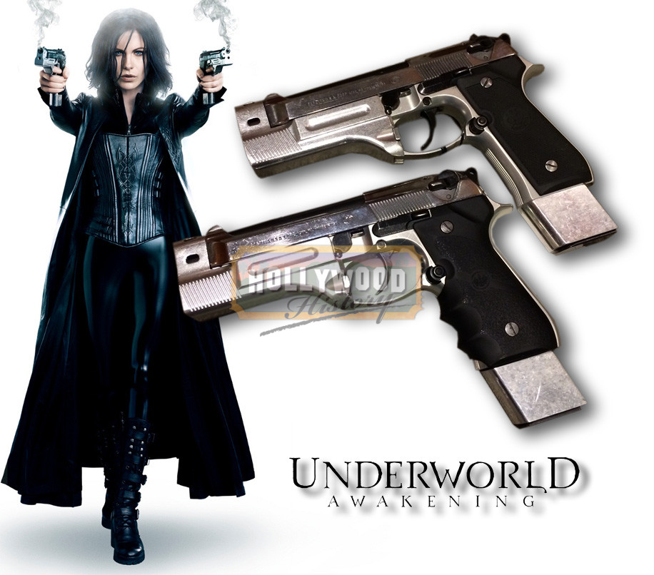 “This is a new war and it’s only the beginning.” – Selene. The Underworld is threatened when mankind discovers the existence of the Vampire and Lycan species that have been thriving in this “alternate universe”. This situation isn’t good for them since mankind has begun a war to literally wipe both species off the face of the earth, like rats during the “Black Plague” years of 14th century Europe. Instead of the Vampires and Lycans banding together against humankind, it’s the “divide and conquer” mentality as they both go after each other as well as their common enemy. These are the screen used and screen matched signature weapons of Selene (Kate Beckinsale) in the 2012 film Underworld: Awakening. In the film Selene uses a pair of modified Beretta 92FS Inox pistols, fitted with extended magazines and large compensators that extend all the way back along the frame to the trigger guard. These same compensators can be seen on the customized Taurus PT92CS in Crying Freeman, and Dark Angel. This is the only pair of live fire pistols created and used during filming so along with the screen time of being used during multiple scenes of the film, the pistols were also heavily fired. These pistols can also be seen and matched on promotional pictures used by the production and on the films movie posters.