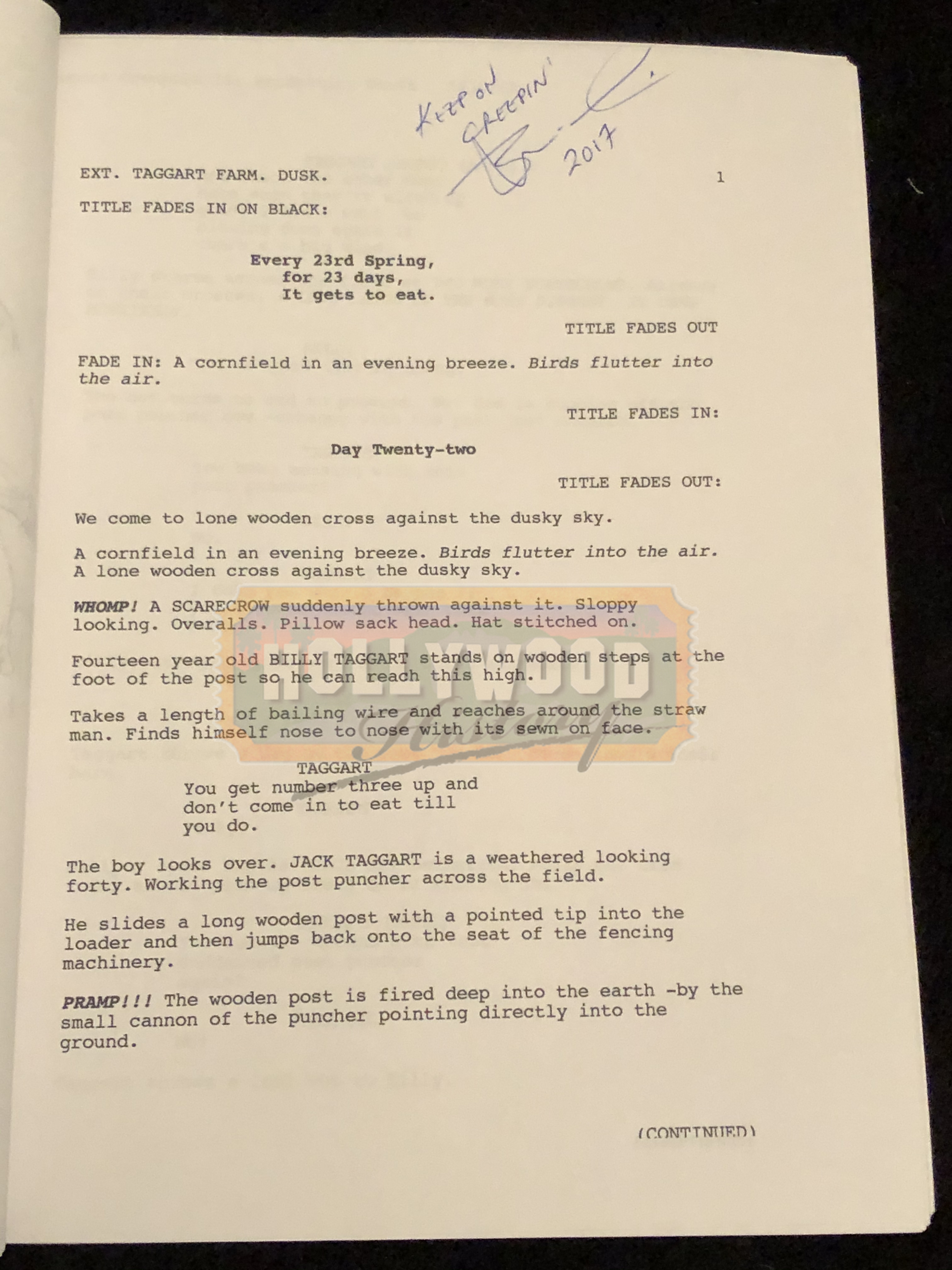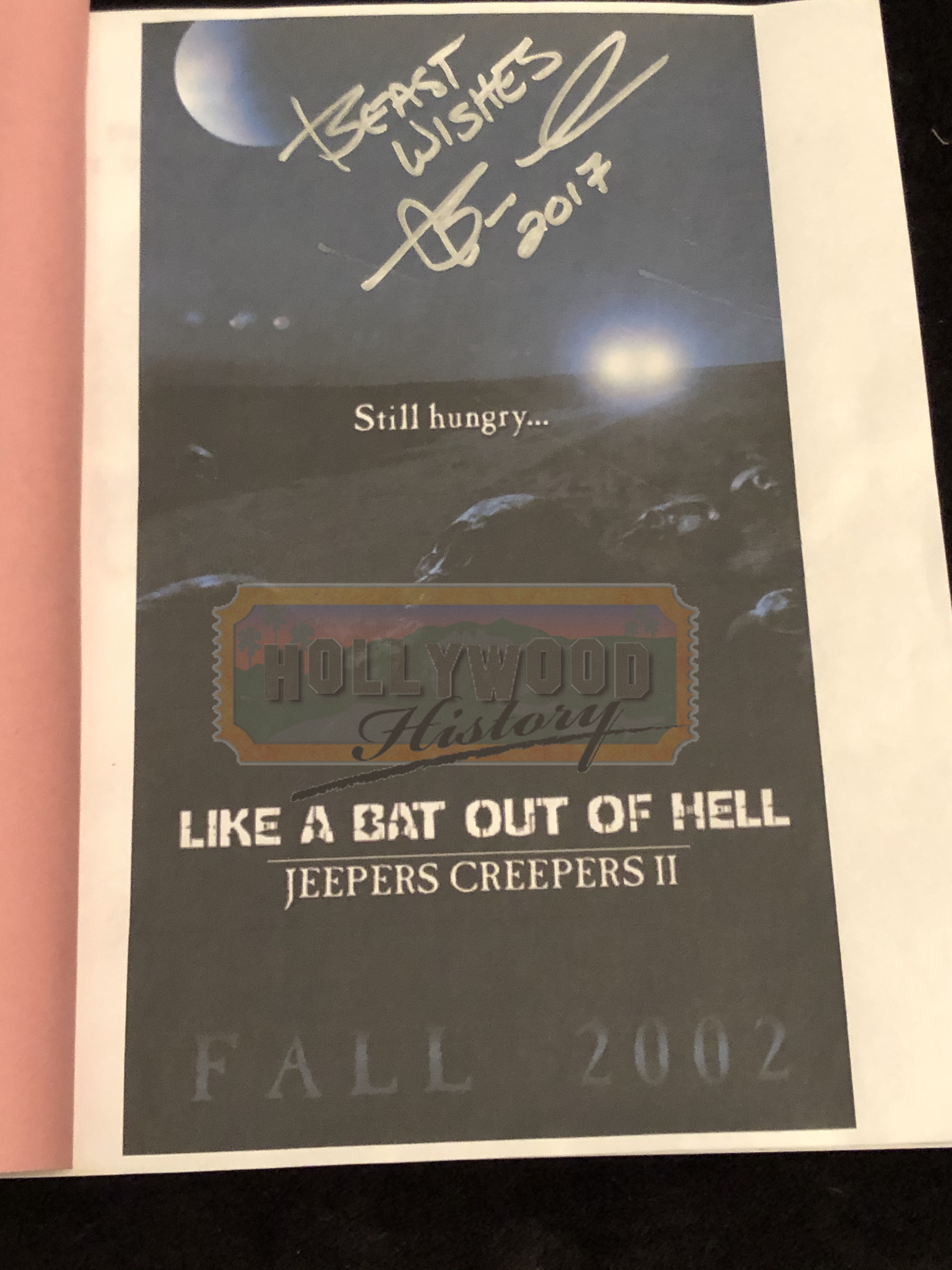 Set a few days after the original, a championship basketball team’s bus is attacked by The Creeper, the winged, flesh-eating terror, on the last day of his 23-day feeding frenzy. This Jeepers Creepers 2 script was owned and signed by Brian Penikas, the creature effects supervisor on the film.