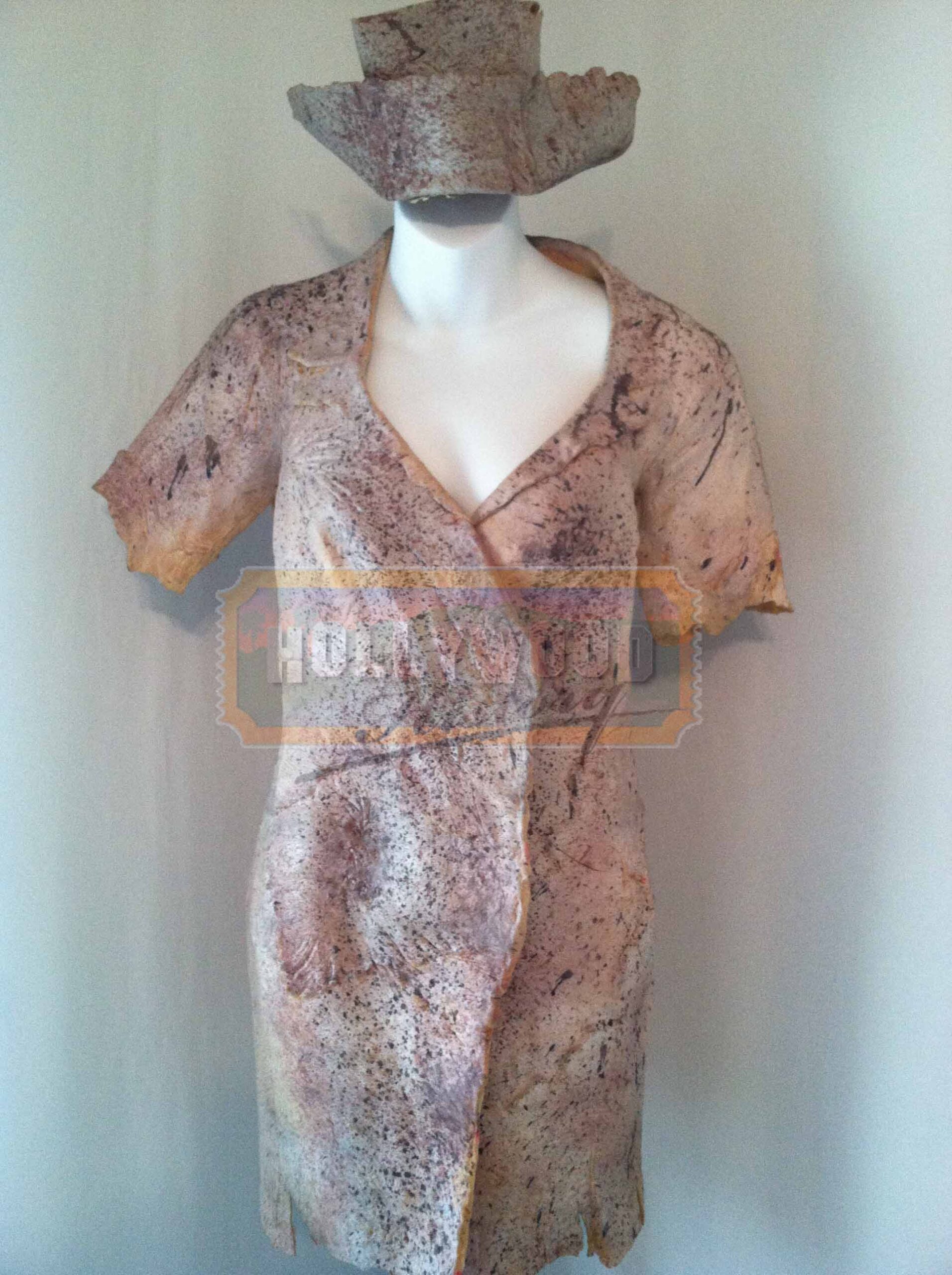 A Dark Nurse’s uniform worn in the 20006 horror movie Silent Hill. The skin-clad women can be seen late in the movie when Rose’s search for her kidnapped daughter takes her to the hospital basement, and these disturbing figures are on guard with sharp instruments and very sensitive to light… The short sleeved dress, hat, and shoes are made from latex with the exception of the shoes and have been given a light spattering of paint in various shades of brown to look like dried blood and is textured the feature scars and wrinkles in the ‘flesh’ and the edges really do look like ragged torn skin. The dress fastens at the front using wide strips of velcro, and the nurse’s hat still has remnants of the foam latex mask along the brim which was removed after filming. A very memorable creature costume from the great movie adaptation of the classic Sony game. There is no size marked and both are in very good condition with some expected wear from use on set.