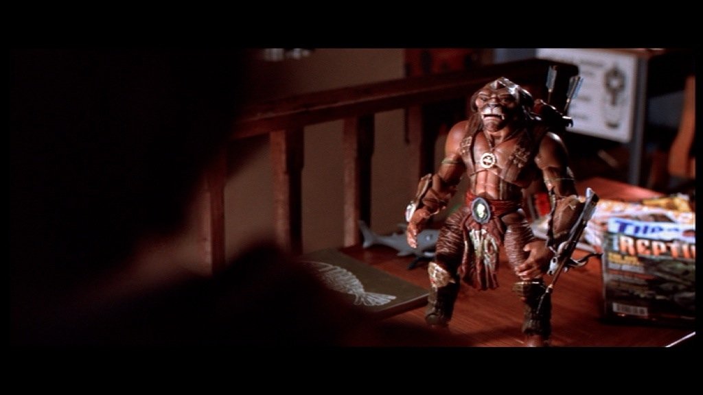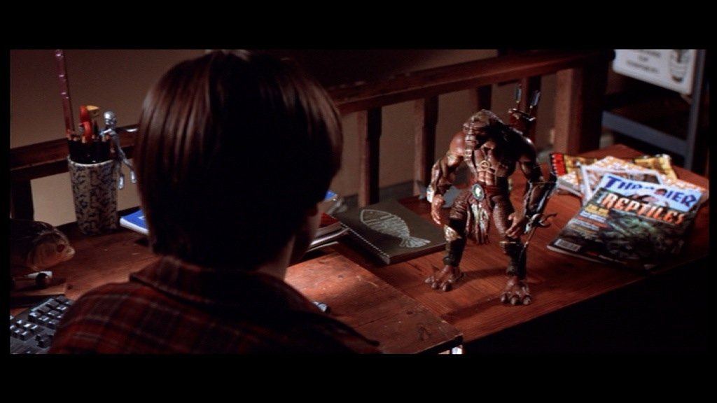 This is a screen-used “Archer” hero puppet with light-up belt from the 1998 film, Small Soldiers, Archer is the leader of the “Gorgonites,” a band of peaceful toy creatures. This puppet was created by the artists at the Academy Award-winning effects house, Stan Winston Studio and this specific puppet was featured in scenes when a static figure was needed instead of the animatronic version. Built on a posable armature with ball and socket joints along with an LED light embedded in the front of the belt buckle that lights up and symbolizes the “toys” being cut on and coming to life.
