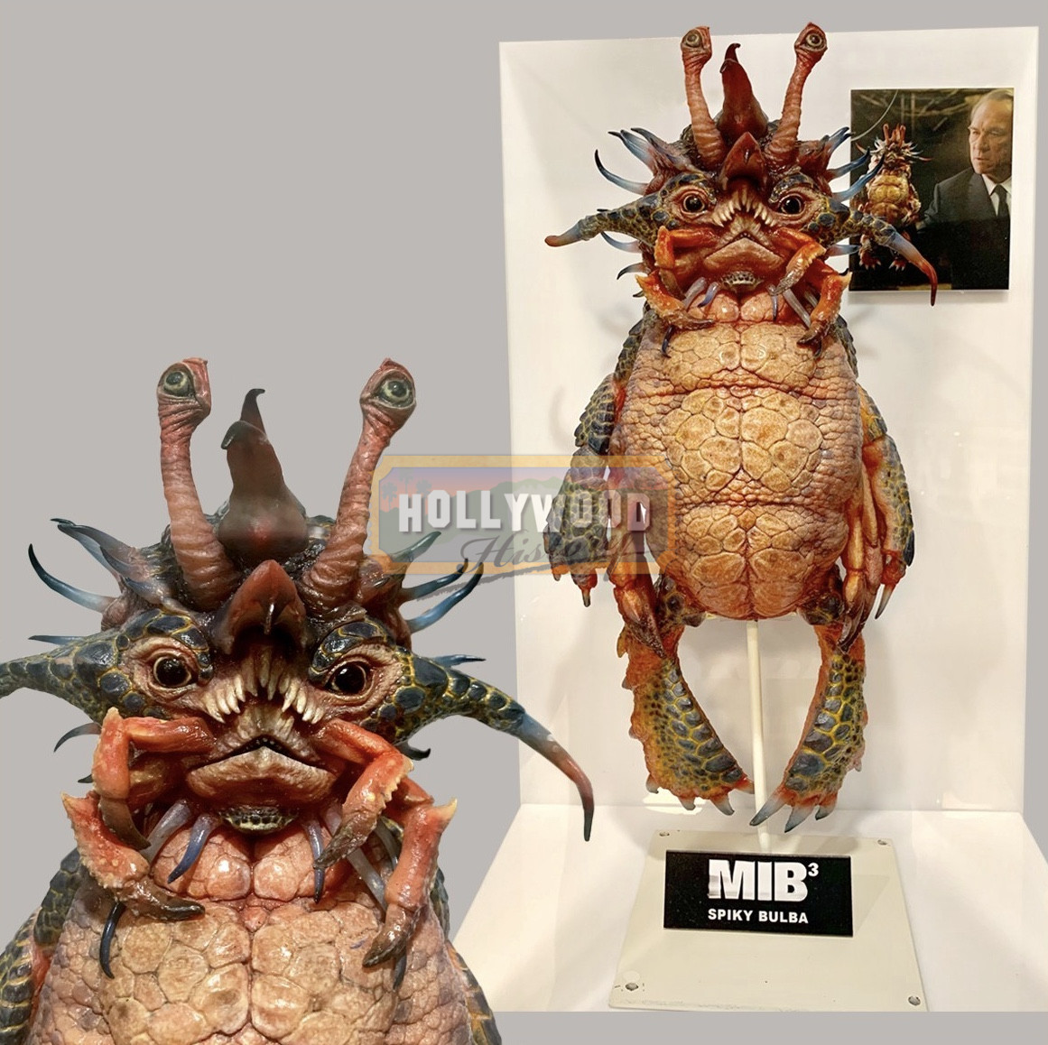 Agent J travels in time to M.I.B.’s early days in 1969 to stop an alien from assassinating his friend Agent K and changing history. This is a Spiky Bulba alien puppet from Barry Sonnenfeld’s 2012 sequel Men in Black 3. Agents J (Will Smith) and K (Tommy Lee Jones) encountered the Spiky Bulba alien in Mr. Wu’s (Keone Young) Chinese restaurant when they investigated his kitchen. Agent J and Agent K arrived at Wu’s Diamond Garden restaurant after hearing reports of his customers suffering from extraterrestrial intestinal worms, Agent K spotted Spiky Bulba served-up in a food dish in the kitchen. Recalling Boris the Animal’s taste for Spiky Bulba, K furiously demanded to know who the creature was for and repeatedly slapped Mr. Wu in the face with the alien when Wu claimed not to know. After it was evident that Wu wouldn’t talk, K gave Spiky Bulba back to the restaurant owner. Created by Rick Baker’s Cinovation Studios, this is the exact puppet seen in the Men In Black 3 Exhibit at Museum Of The Moving Image in Queens, New York.