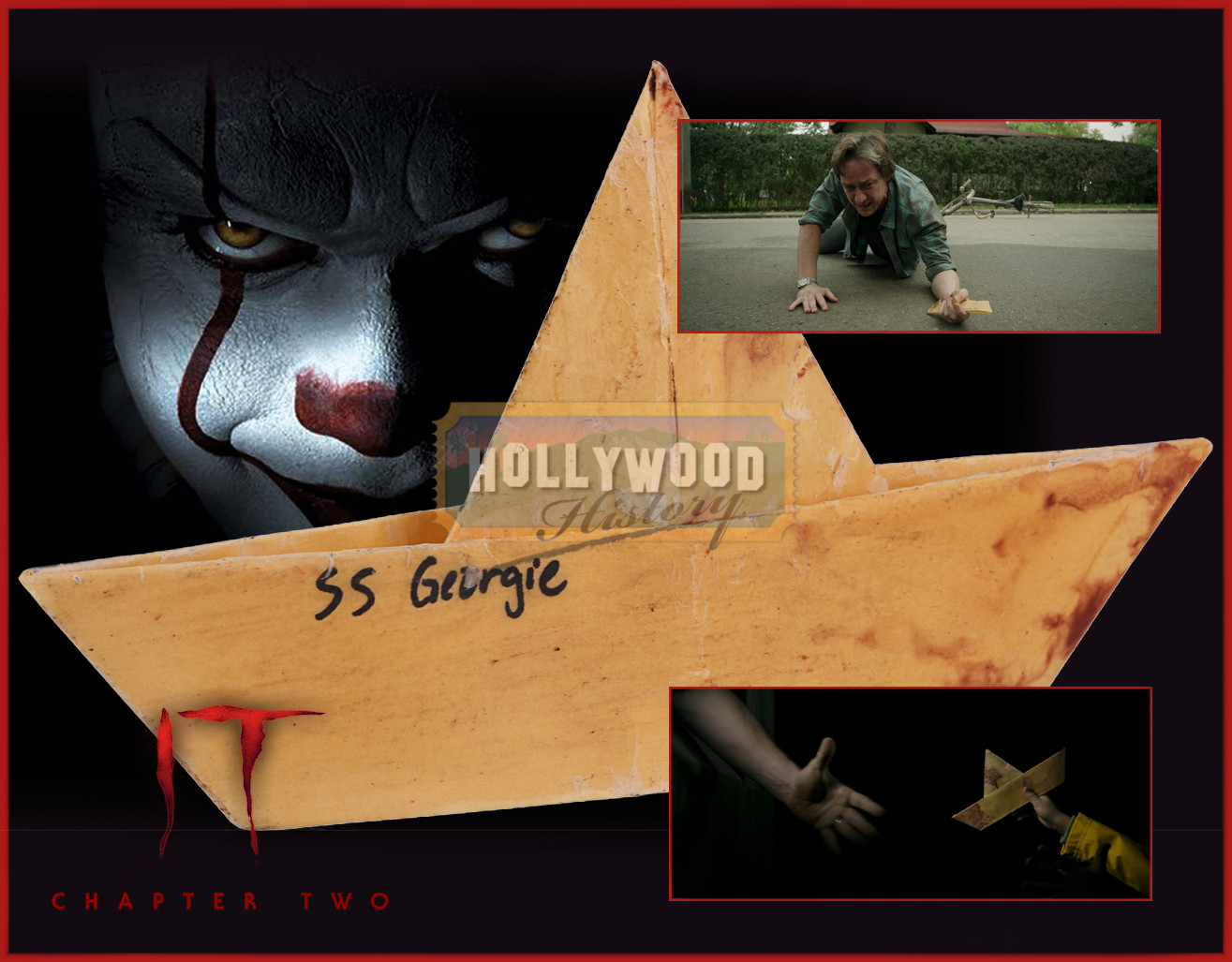 Twenty-seven years after their first encounter with the terrifying Pennywise, the Losers Club have grown up and moved away, until a devastating phone call brings them back. From Andy Muschietti’s 2019 horror sequel It Chapter Two. This is the SS Georgie paper boat Bill’s (James McAvoy) younger brother George (Jackson Robert Scott) perished at the hands of It while playing with his paper boat, the SS Georgie. The boat is made of paper, covered with wax to make it waterproof. It is stained with faux blood and “SS Georgie” is handwritten in black marker on one side.