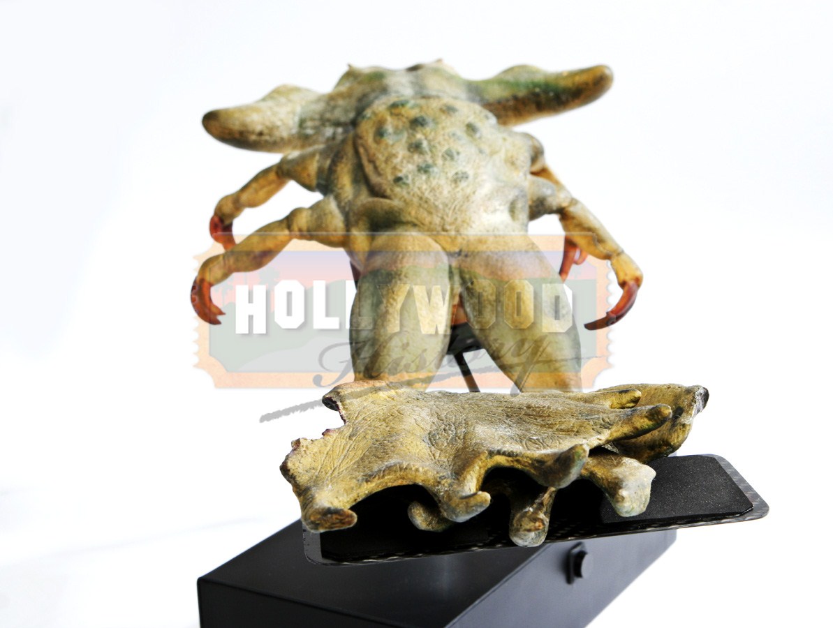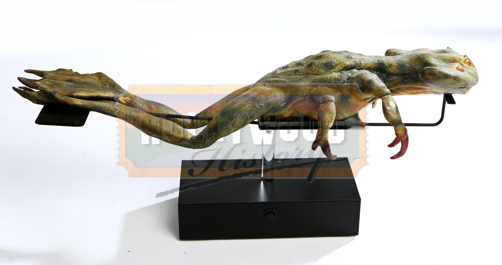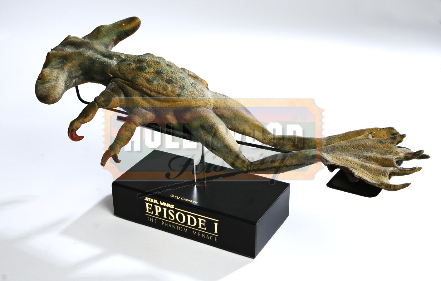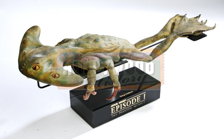 This item is a Gorg creature used in the 1999 sci-fi prequel Star Wars Episode One: The Phantom Menace. These strange looking creatures can be seen in the film hanging from a stall in the Mos Espa marketplace. Made from foam rubber the four-eyed, frog like alien has an interesting green skin with blue detailing and long thin legs with large feet that show evidence of being tied up for the piece to hang upside down. The Gorg creature comes on a laser cut display with a lighted logo operated by a battery and can be cut on and off by a switch.