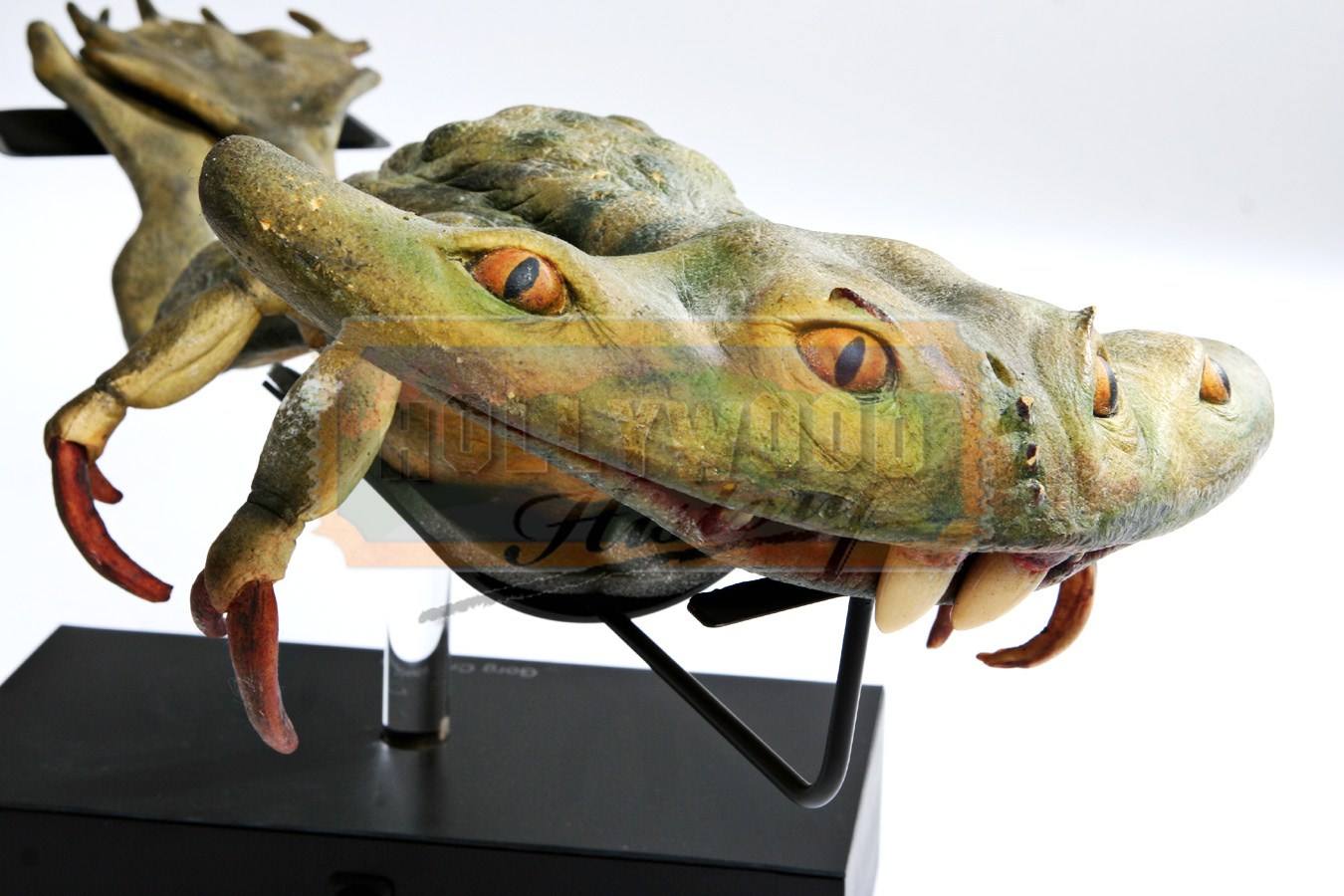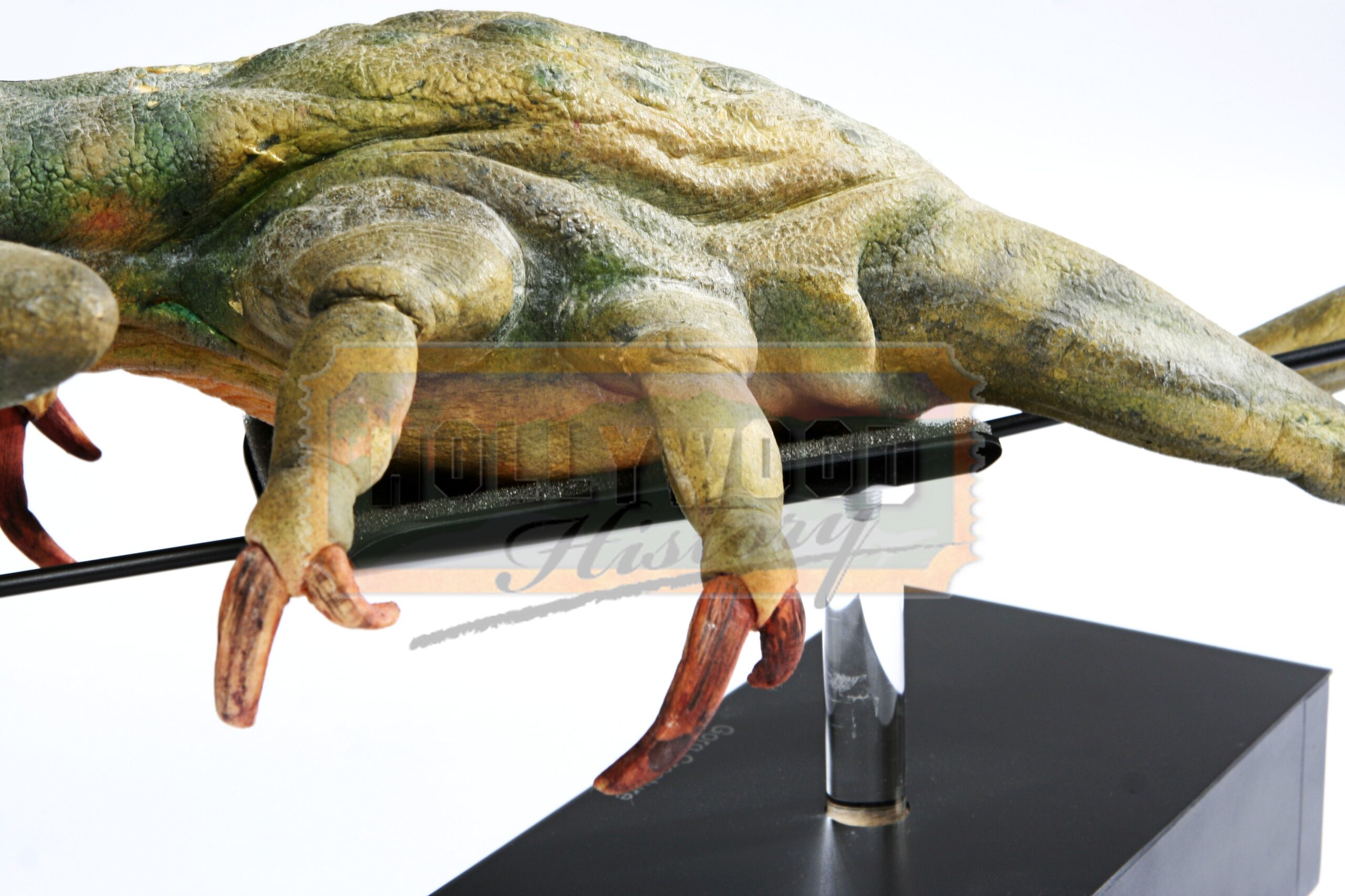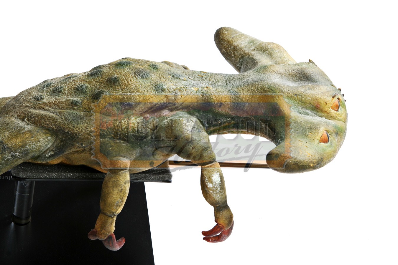 This item is a Gorg creature used in the 1999 sci-fi prequel Star Wars Episode One: The Phantom Menace. These strange looking creatures can be seen in the film hanging from a stall in the Mos Espa marketplace. Made from foam rubber the four-eyed, frog like alien has an interesting green skin with blue detailing and long thin legs with large feet that show evidence of being tied up for the piece to hang upside down. The Gorg creature comes on a laser cut display with a lighted logo operated by a battery and can be cut on and off by a switch.
