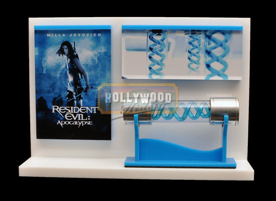 Something evil’s lurking in Raccoon City, and the fearless Alice (Milla Jovovich, reprising her role from the original film), is one of only a few willing to put her life on the line to investigate the malevolent force. A virus is attacking the area’s denizens, turning them into the undead. With the help of her colleague, Jill (Sienna Guillory), Alice sets out to uncover the truth, even as she fends off her biggest enemy, Nemesis (Mabius). This prop T-virus vial was used on screen and can be seen periodically throughout the film. The vial has metal ends and a clear plastic center. Inside the vial are two blue colored transparent spiral tubes.