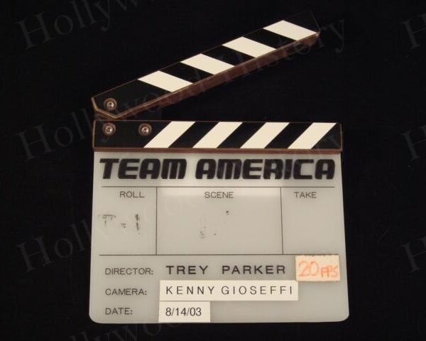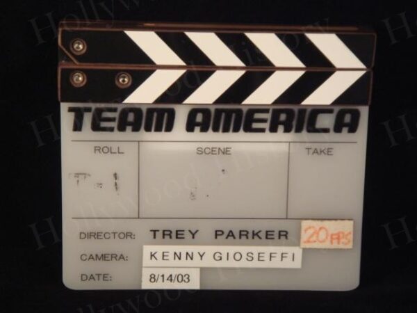 “Team America: World Police” is an action adventure from the creators of “South Park,” starring an all-marionette cast. This production used clapper board from the 2004 film Team America was used when filming on the smaller scaled sets. This production device has the movie title and the director name Trey Parker printed on it, along with the cinematographer Kenny Gioseffi. The board also has categories for hand noting the roll, scene and take which could be written on with dry marker and then wiped off. Measures 5 1/2″ x 6″