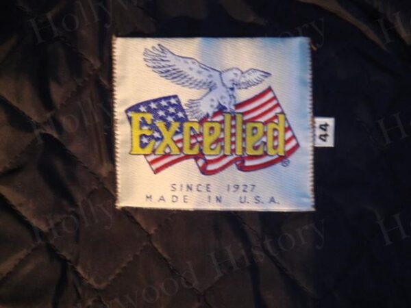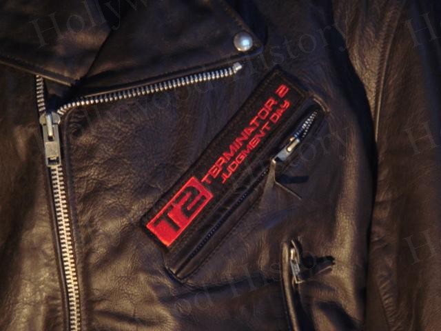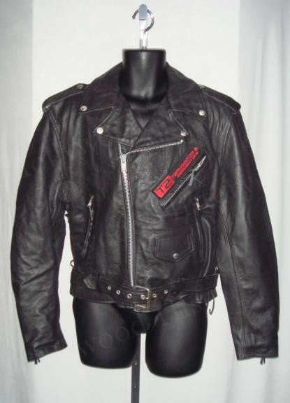 Black leather crew biker jacket from the film Terminator 2. It has an embroidered T2 Terminator Judgement Day patch on the left chest. It is made by Excelled and is a size 44. Jacket has not been worn.