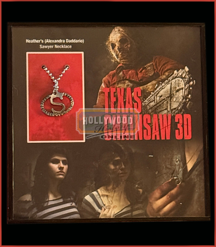 A young woman travels to Texas to collect an inheritance; little does she know that an encounter with a chainsaw-wielding killer known as “Leatherface” is part of the reward. Along with being used by various characters in the film, this is Heather Miller’s (Alexandra Daddario) hero “S” necklace from the 2013 production Texas Chainsaw 3D. In the film Heather has a burn mark in the shape of this necklace but doesn’t realize that the “S” in the mark stands for “Sawyer” and that she is part of the family. This necklace is the key prop from which the story line is based and is constantly referenced and seen throughout the film. After the original film ends the town members torch the Sawyer house and shortly after find one of the Sawyer women holding a baby. While the mother is wearing the necklace, the baby being held has the symbol of the necklace burnt onto her skin due to the fire. Once Heather is grown and her grandmother passes away, she is told that the estate has been left to her along with a letter that she never opens. Upon entering the house they find that one of the relatives, “Leatherface” is still alive in the basement and begins to take revenge. After seeing the mark on Heather and realizing she is part of the Sawyer family he decides to let her live making this the key prop of the film.
