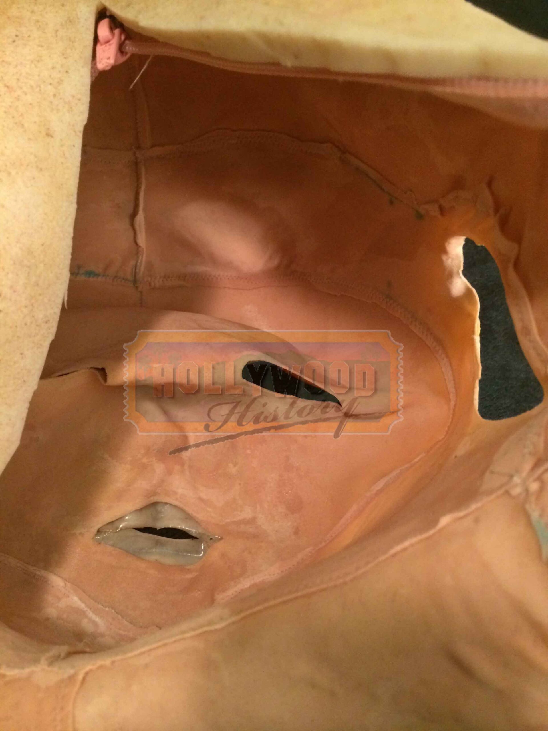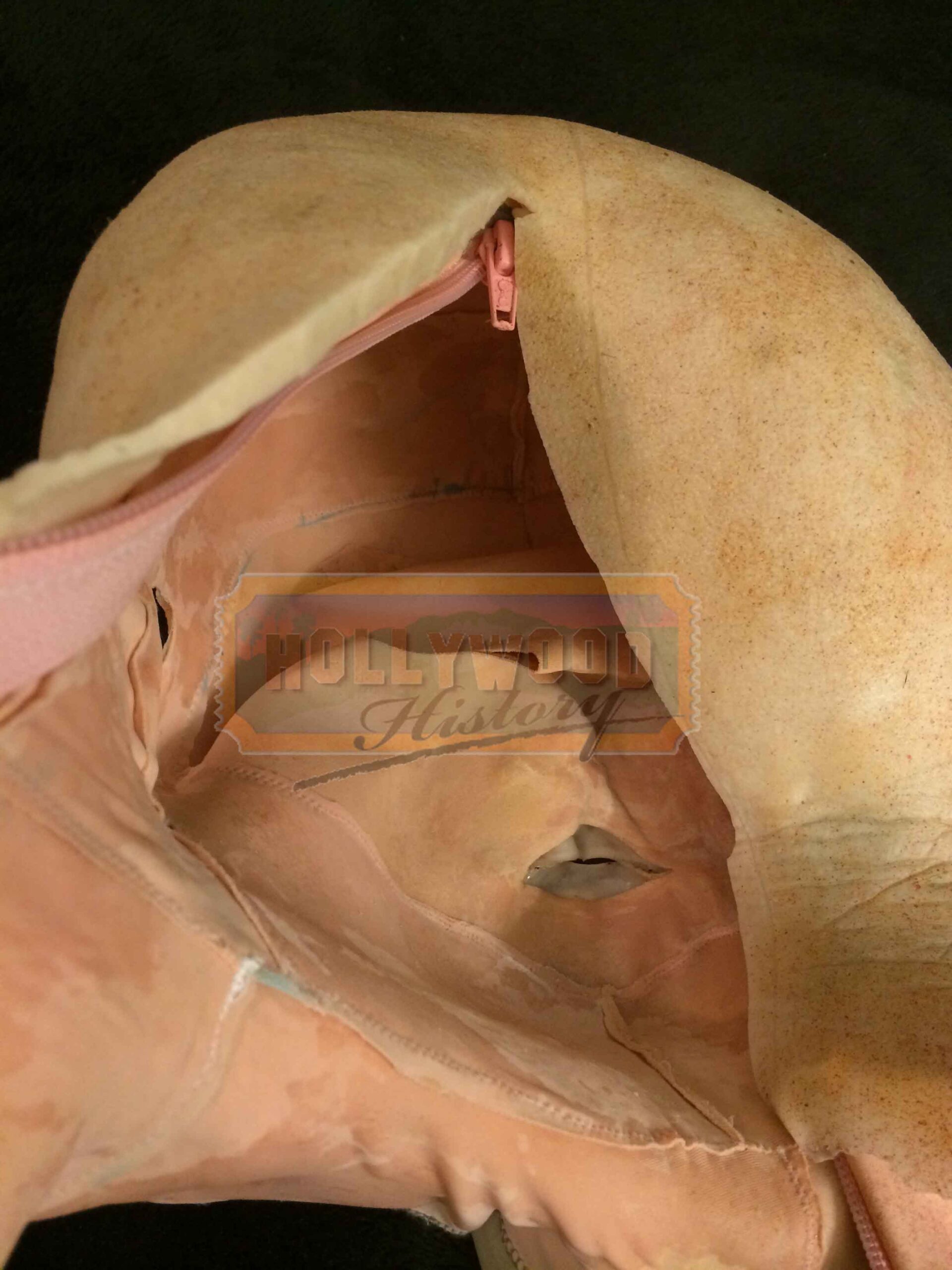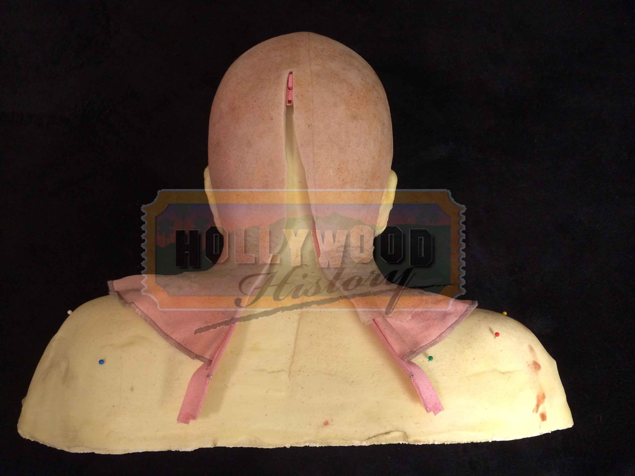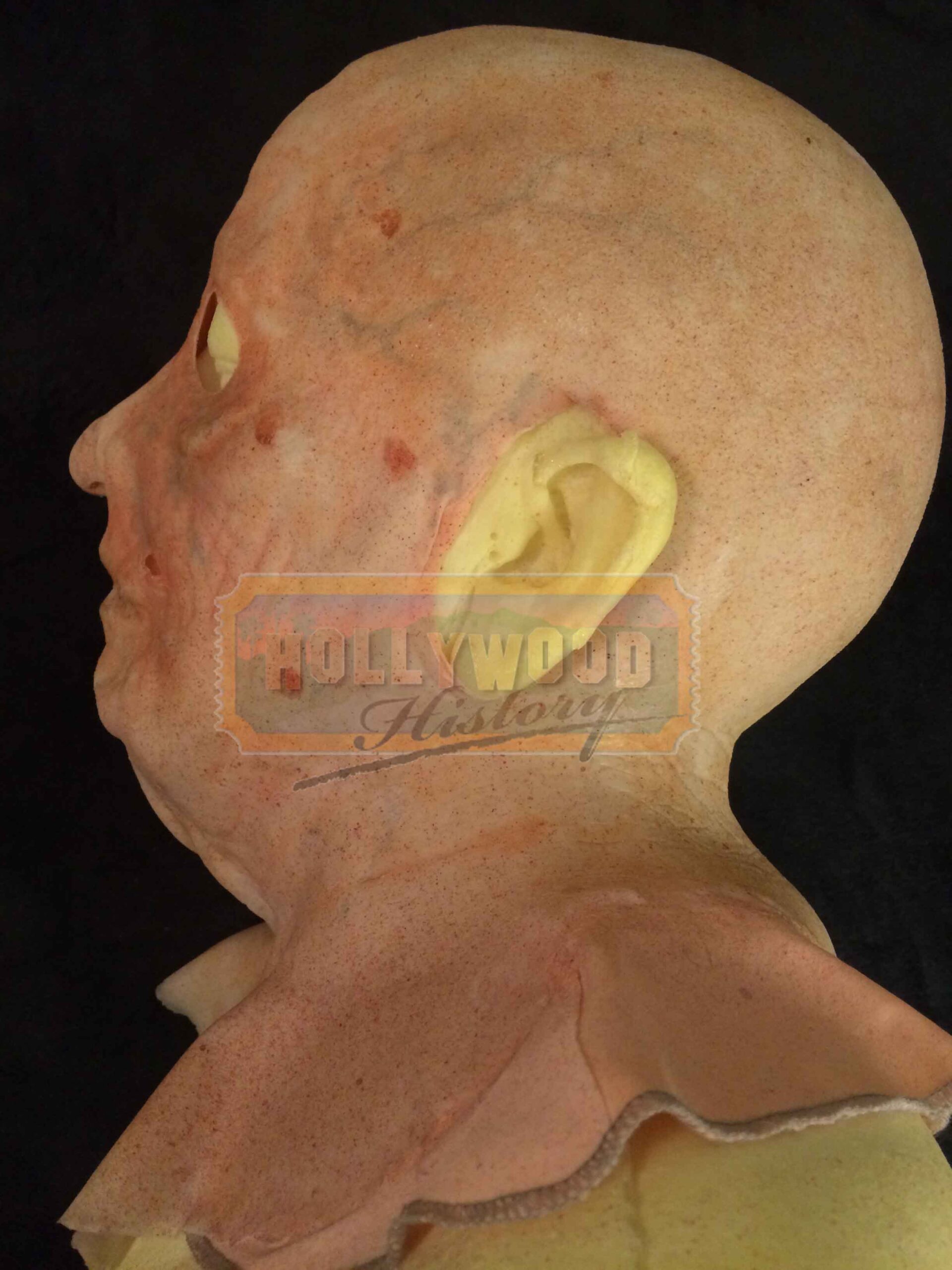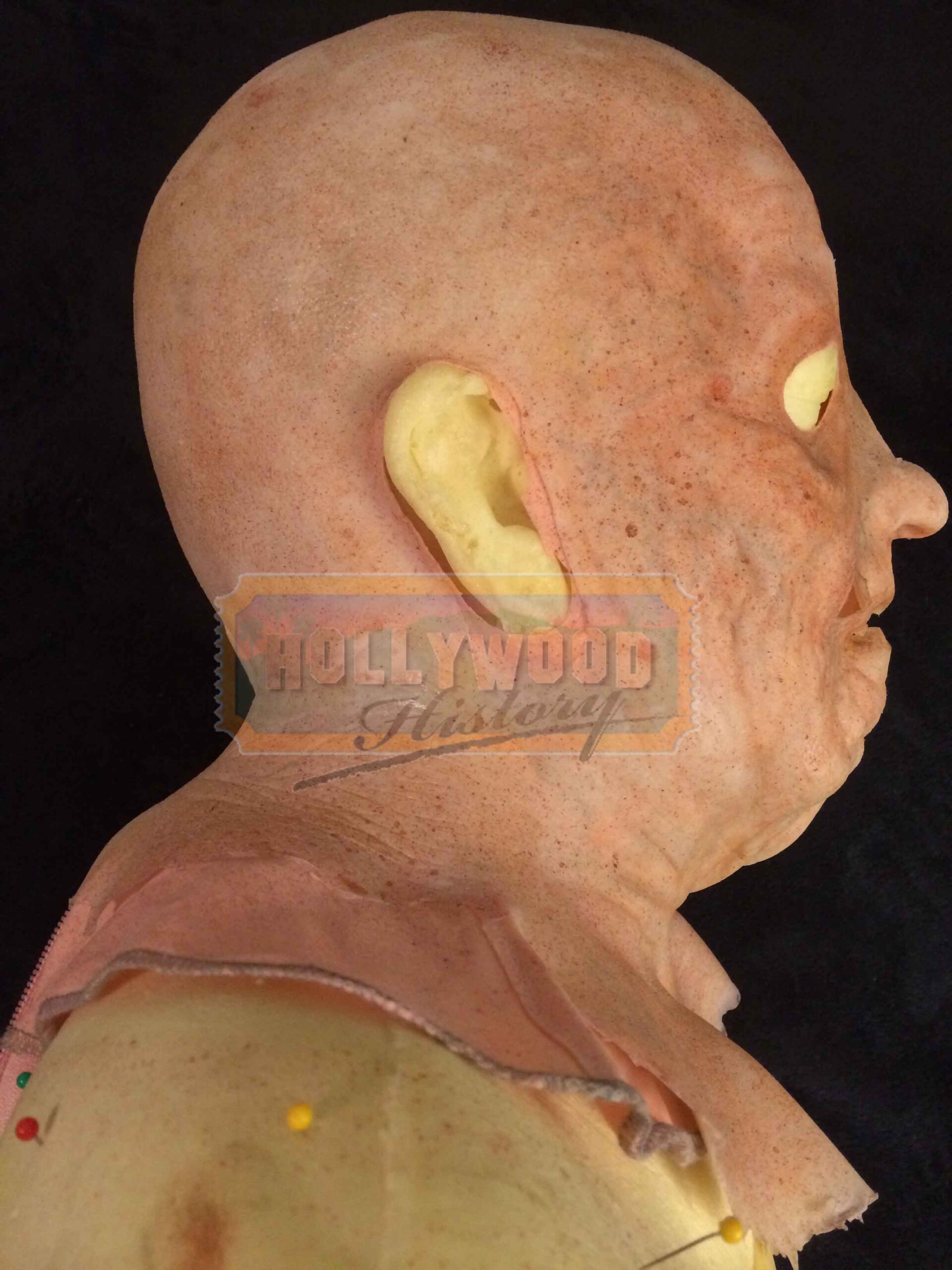 This is Grandpa Sawyer’s (john Dugan) pull over mask from John Luessenhop’s 2013 thriller, Texas Chainsaw 3D. In the film, Heather Miller (Alexandra Daddario) and her friends come across a mysterious inheritance and a gruesome relative, the killer Leatherface (Dan Yeager). This pull over mask was used by John Dugan as the face of Grandpa Sawyer while reprising his role as “Grandpa” from the 1974 film Made of silicone with a zip up back, cloth support and has been designed to appear as aged/old skin. The mask is still in excellent production used condition and also includes a production used foam life cast of the actor for it to be displayed on. Please see our Custom Display Options, View our Gallery, or Contact Us for more information about Custom Displaying this item.