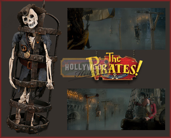 “Fire those long things that go bang!” From the 2012 Aardman stop motion film The Pirates! Band of Misfits, Hugh Grant stars in his first animated role as the luxuriantly bearded Pirate Captain; a boundlessly enthusiastic, if somewhat less-than-successful, terror of the High Seas. With a rag-tag crew and seemingly blind to the impossible odds stacked against him, the Captain has one dream: to beat his bitter to the much coveted Pirate of the Year Award. It’s a quest that takes our heroes from the shores of exotic Blood Island to the foggy streets of Victorian London. Along the way they do battle with the pirate-hating Queen Victoria and team up with a young Charles Darwin, but never lose sight of what a pirate loves best: adventure. The skeleton of this unfortunate pirate was made for the scene in Thames Dock, serving as a warning to all buccaneers sailing into London that under no circumstances will pirates be tolerated by the evil Queen Victoria. The cage is made from resin and decorated to look like rusty metal. The skeleton is also resin with his clothing made from treated cloth.
