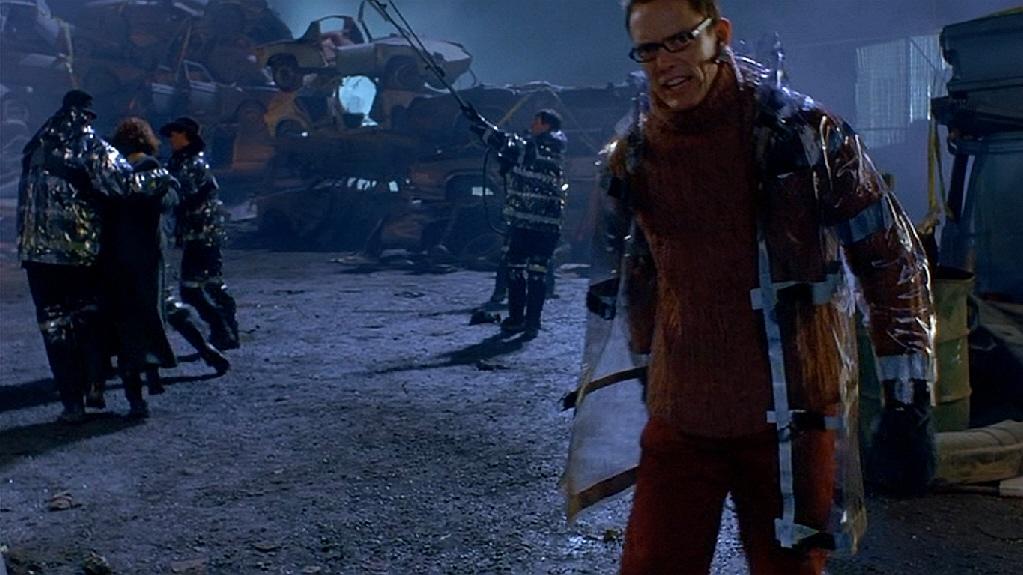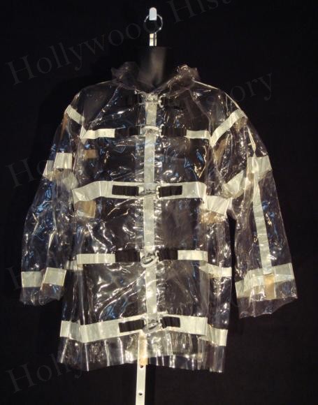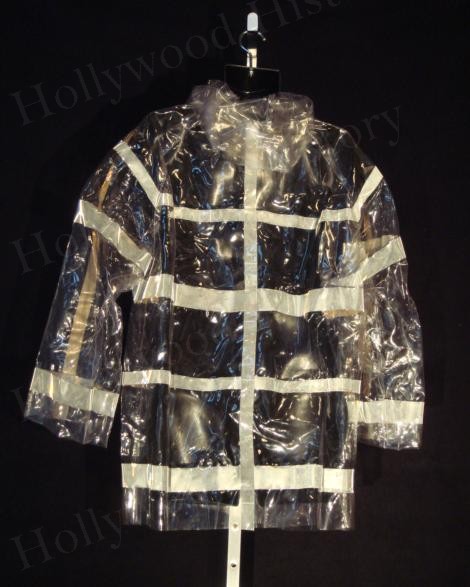 This is one of the reflective raincoats used in the beginning scenes of the 2001 film “Thir13en Ghosts”. Made of a vinyl material with reflective stripes these jackets can be seen being worn when Cyrus Kriticos and his employees enter into the junkyard attempting to catch the ghost Breaker Mahoney or “Juggernaut”.
