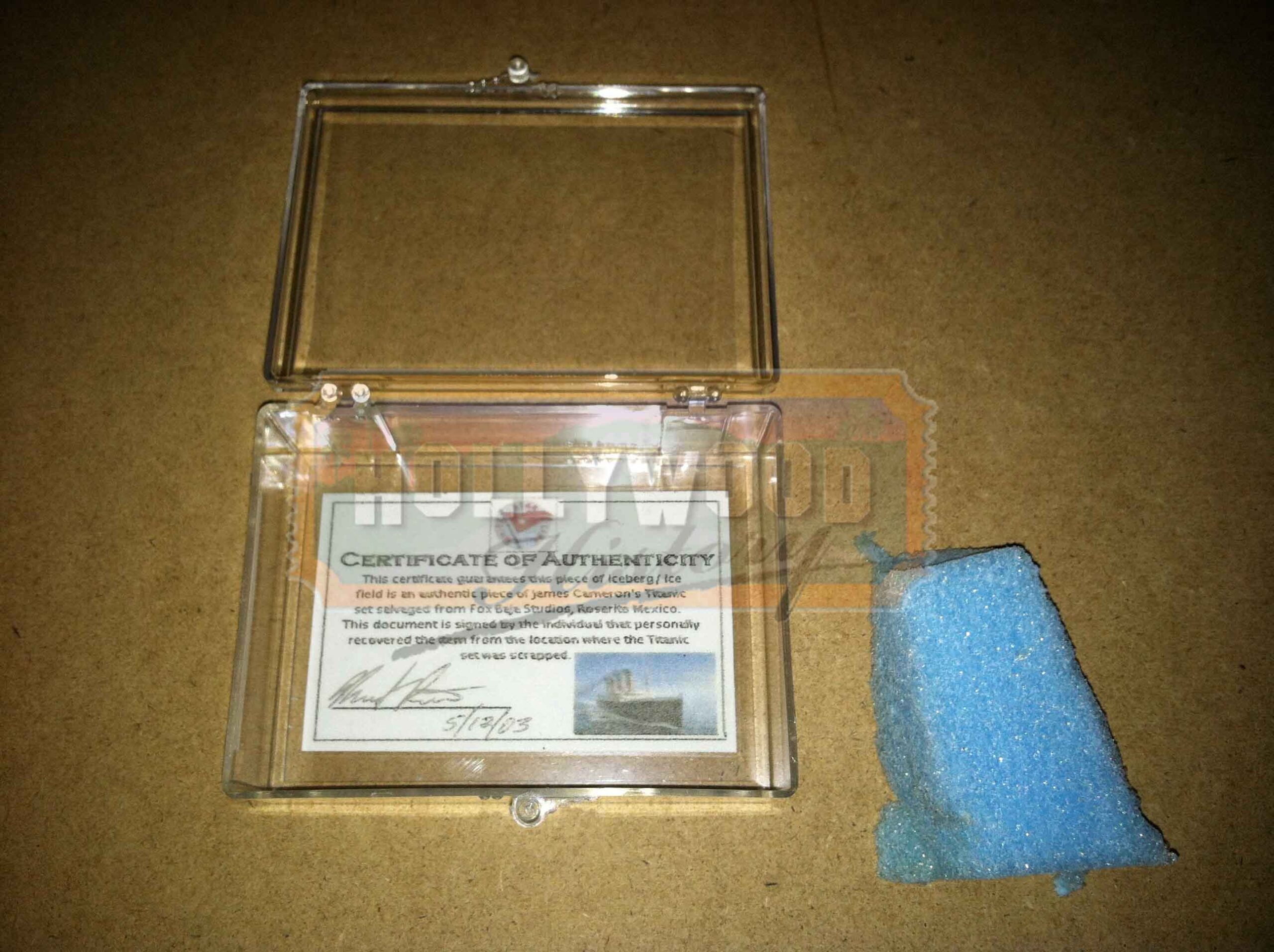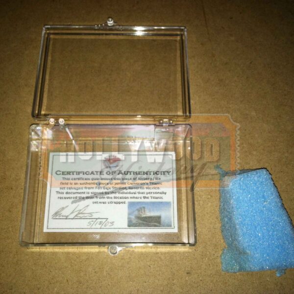 84 years later, a 101-year-old woman named Rose DeWitt Bukater tells the story about her life set in April 10th 1912, on a ship called Titanic when young Rose boards the departing ship with the upper-class passengers and her mother. Meanwhile, a drifter and artist named Jack Dawson and his best friend Fabrizio De Rossi win third-class tickets to the ship in a game. And she explains the whole story from departure until the death of Titanic on its first and last voyage April 15th, 1912 at 2:20 in the morning. This is a piece of iceberg from the film’s set and comes with the original COA. Please see our Custom Display Options, View our Gallery, or Contact Us for more information about Custom Displaying this item.