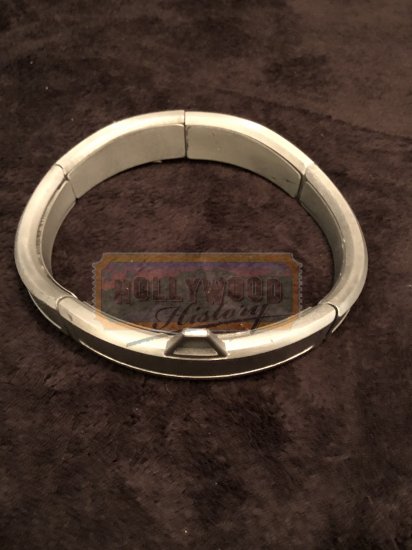 Colony citizen Douglas Quaid has been having dreams of being a secret agent, aided by an unnamed woman. Tired of his factory job building police robots with friend Harry, he visits Rekall, a company that implants artificial memories. Quaid chooses a fantasy as a secret agent. An emblem of Rekall is stamped onto his arm and, just as the fantasy is being loaded by technician McClane, they discover that Quaid already has real memories of being a spy. This screen used necklace was worn by Quaid to sneak through customs but eventually malfunctions revealing Quaid’s true identity to the UFB who are hunting him.