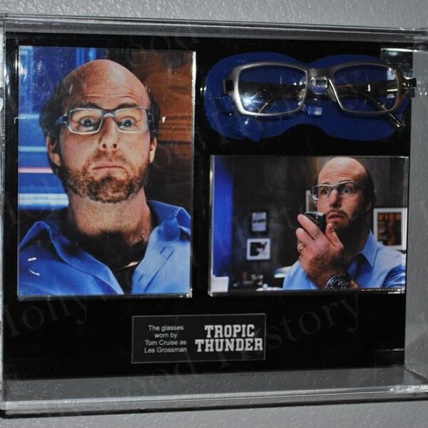A film crew is in Southeast Asia filming a Vietnam-war memoir. It’s early in the shooting, but they’re already behind schedule and over budget. On the day an accident befalls the novice director, the cast and crew are attacked by a gang of poppy-growing local drug dealers, except the cast and crew don’t realize these aren’t actors who are stalking them. The thugs kidnap Tugg Speedman, an actor whose star seems on the decline, and it’s up to the rest of the ragtag team to band together long enough to attempt his rescue. This is the pair of eyeglasses worn by Tom Cruise as his character Les Grossman. He can be seen wearing these throughout the film. They are made of metal and plastic. Comes with an acrylic display case measuring approx 10.5″ x 13″