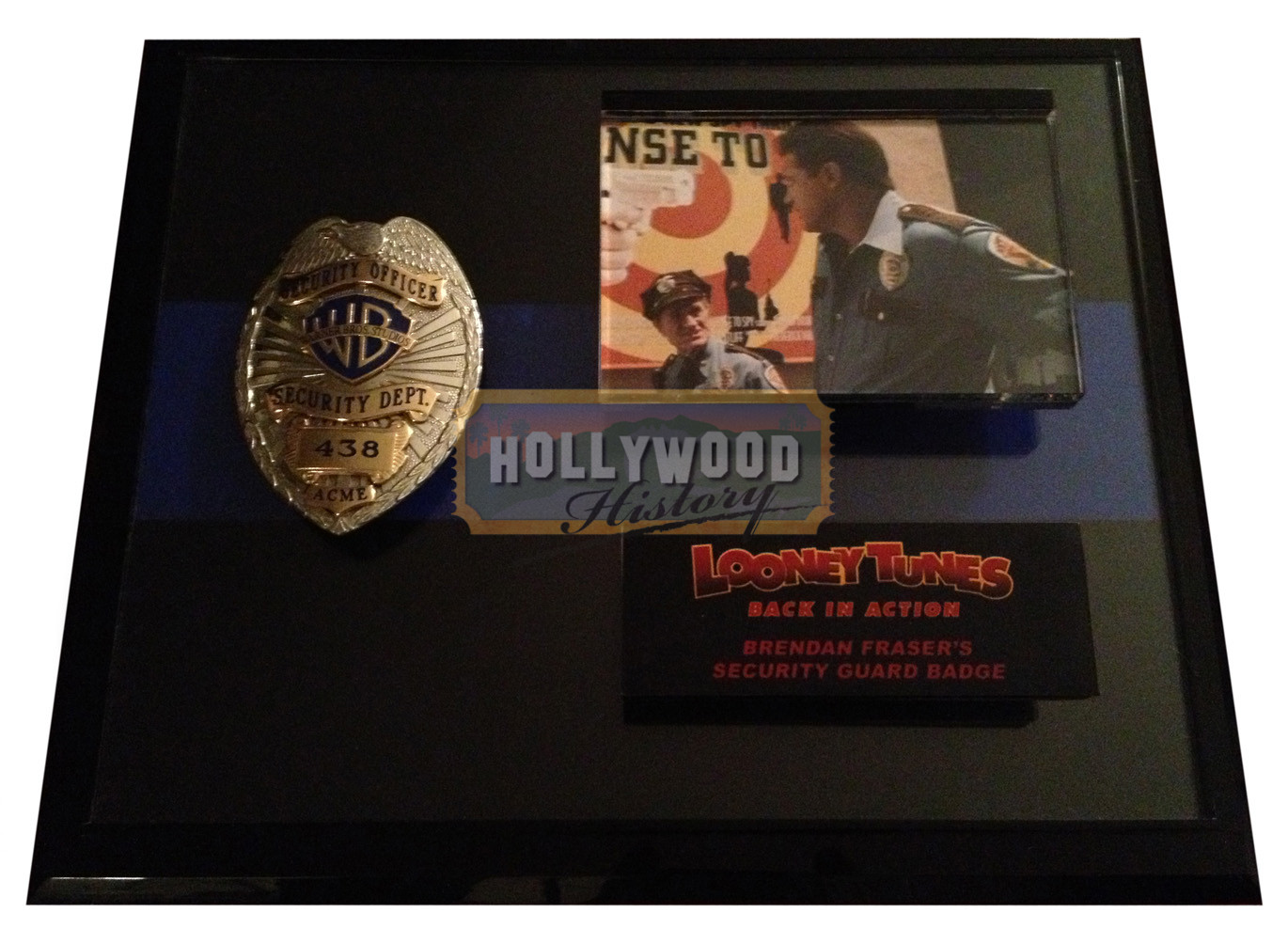 This is a security officer’s badge from the 2003 film Looney Tunes: Back in Action. This style badge can be seen worn by Warner Bros. Studios guards throughout the film as a former guard (Brendan Fraser) and the Looney Tune characters search for the mythical Blue Monkey Diamond. The metal badge features an eagle with spread wings at top and gold emblems which include the WB logo as well as badge number (438) and “Acme” written across the bottom.