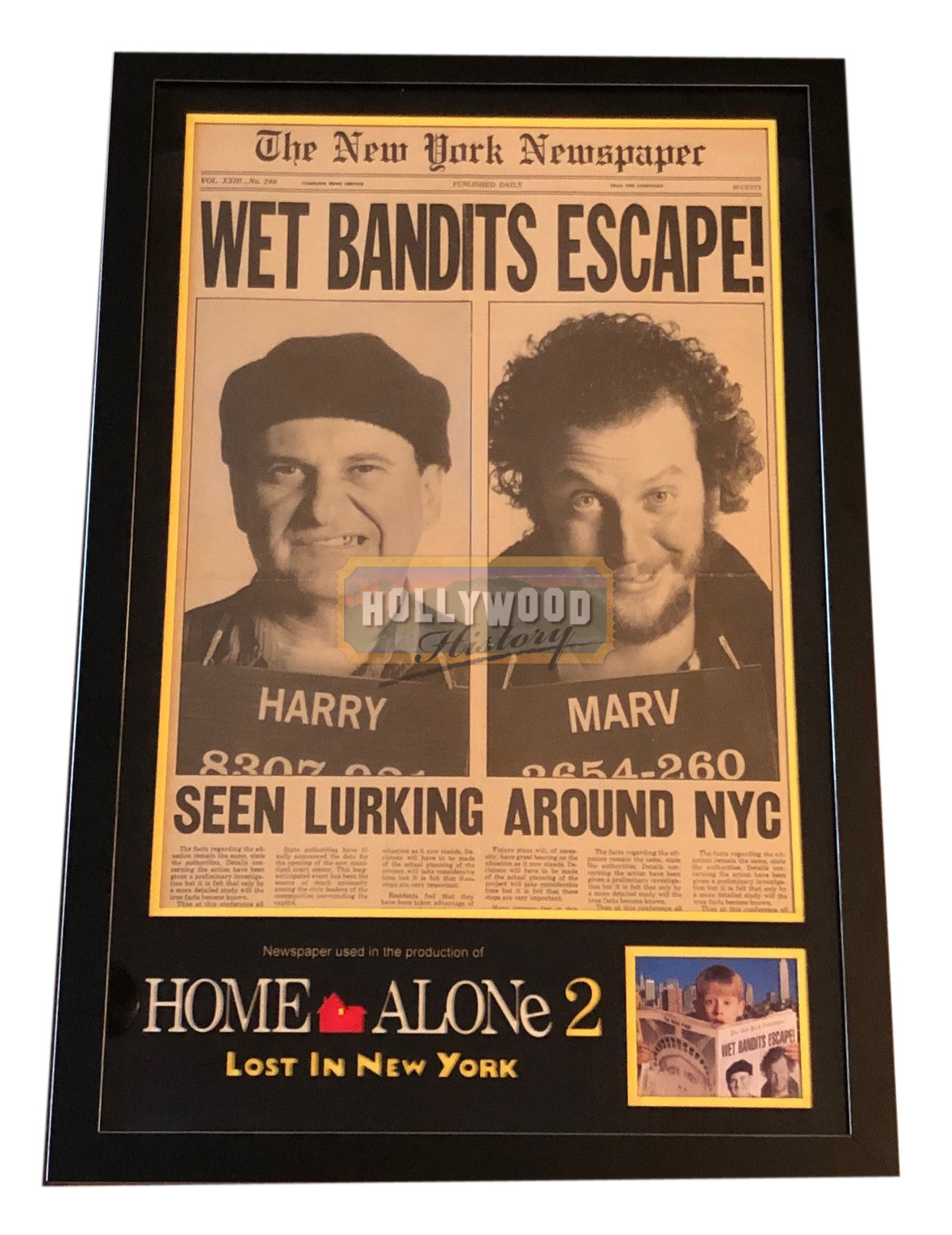 An original prop created for the production of Home Alone 2: Lost in New York, the 1992 comedy sequel starring Macaulay Culkin. This prop New York Newspaper cover was custom made by the production and features imagery of Harry (Joe Pesci) and Marv’s (Daniel Stern) police mugshots. In the movie a different paper is used to set the scene that the duo have escaped while the family are still in Chicago however this design of newspaper did inspire the one held by Kevin (Macaulay Culkin) on the famous poster which was partially computer generated and used extensively during promotion becoming arguably the most famous image associated with the movie. The prop newspaper cover features the mugshots of the two characters with the headline “WET BANDITS ESCAPE!” and unrelated text below and to the back page, this being altered on the poster to include an image of the Statue of Liberty in aftershave pose in a nod to the first movie, this too obvious to include on a prop intended to be used on screen.