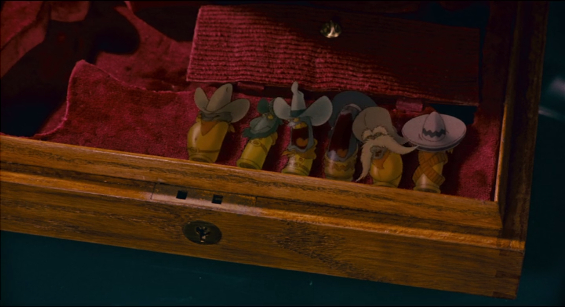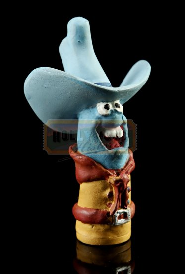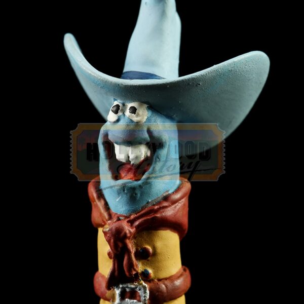 A Painted Dum-Dum bullet made for the production of Robert Zemeckis’ cartoon and live-action mashup Who Framed Rodger Rabbit. In the film, Eddie (Bob Hoskins) switches his real gun out for a cartoon one before entering Toontown. Eddie’s new oversized gun shoots .38 bullets which are later referred to as ‘Dum-Dum’ bullets. This Dum-Dum bullet served as a real-world reference for animators during the film’s post-production process. Cast in resin, and approx. 2″ tall; this bullet is painted with a color scheme similar to what appears in the final on-screen design. Dressed like a cowboy, this piece is full of the cartoonish personality the film is known for.