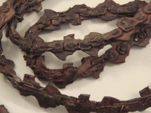 In a throwback to 1970’s horror films such as “The Texas Chainsaw Massacre” and “The Hills Have Eyes”, “Wrong Turn” is an independently-made horror film about a group of five youths on a hiking trip in the Appalachains of West Virginia who become prey to a family of cannibalistic mountain men who have become horribly disfigured through generations of in-breeding. This chainsaw chain can be seen when the main character Chris kills one of these mutant people. It is made of rubber and is approx. 6″.